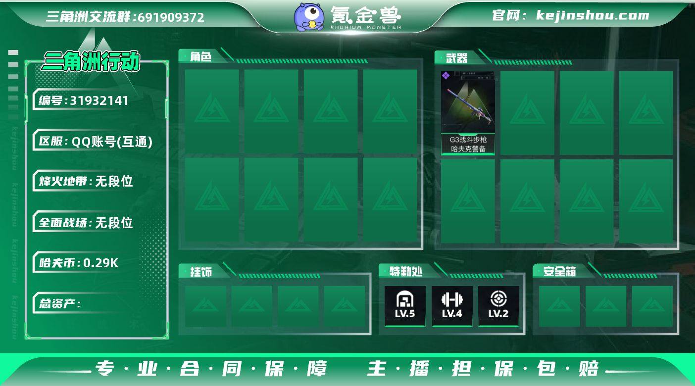 04M】【Q区三端互通】【可二次】z8811-特勤处:仓库5级/靶场2级/训练中心4级-总资产104m-哈夫币29w-烽火等级:60级 【近战皮肤】:近战-暗星,近战-黑鹰 【传说外观】:腾龙突击步枪-万金泪冠,47突击步枪-暗星,SR-3M紧凑突击步枪-暗星,勇士冲锋枪-万金泪冠,M14射手步枪-蛮荒,AWM狙击步枪-万金泪冠 【史诗外观】:K416突击步枪-腊梅,G3战斗步枪-哈夫克警备,SR-3M紧凑突击步枪-开工大吉,勇士冲锋枪-丛影谍踪,MP7冲锋枪-六套之力,PKM通用机枪-阿萨拉特攻,M249轻机枪-丛影谍踪,VSS射手步枪-丛影谍踪, M14射手步枪-航天庆典 【稀有外观】:K416突击步枪-一帆风顺,SG552突击步枪-2026,SG552突击步枪-马年新春, AK-12突击步枪-马年新春,CAR-15突击步枪-来财,腾龙突击步枪-冰天雪地,KC17突击步枪-来财,UZI冲锋枪-亚特兰蒂斯,SMG-45冲锋枪-行动开启,SMG-45冲锋枪-幻影结构,SR-3M紧凑突击步枪-马年新春,M1014霰弹枪-幻影结构,M249轻机枪-冰天雪地,QJB201轻机枪-哈夫克卫队,Mini-14射手步枪-荣耀列队,Mini-14射手步枪-来财,SKS射手步枪-弄臣,SV-98狙击步枪-星链科技,SV-98狙击步枪-哈夫克航天,SV-98狙击步枪-精英联盟 【普通外观】:PKM通用机枪-黄铜,M4A1突击步枪-高雅黑,M4A1突击步枪-海色,QBZ95-1突击步枪-海色,QBZ95-1突击步枪-2026,腾龙突击步枪-三角洲力量,K416突击步枪-高雅黑,K416突击步枪-重击,M16A4突击步枪-高雅黑,M7战斗步枪-重击,SG552突击步枪-浅蓝涂装,SG552突击步枪-海浪,SCAR-H战斗步枪-数码迷彩,PTR-32突击步枪-典雅,MP5冲锋枪-典雅,Vector冲锋枪-几何迷彩,UZI冲锋枪-海色,UZI冲锋枪-重击,野牛冲锋枪-高雅黑,M1014霰弹枪-海浪,M1014霰弹枪-重击,M249轻机枪-黄蜂,QJB201