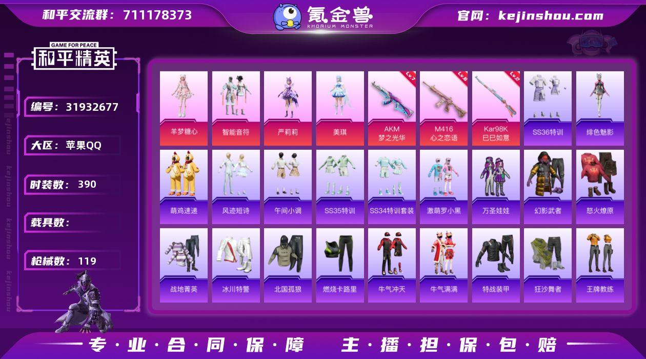 【主播推荐】实名: 不可修改 时装数: 390 枪械数: 119 战备数: 90 热门装扮: 万圣娃娃,智能音符,激萌罗小黑,严莉莉,美琪,羊梦糖心 稀有枪皮: M416心之恋语,AKM梦之光华,Kar98K-巳巳如意