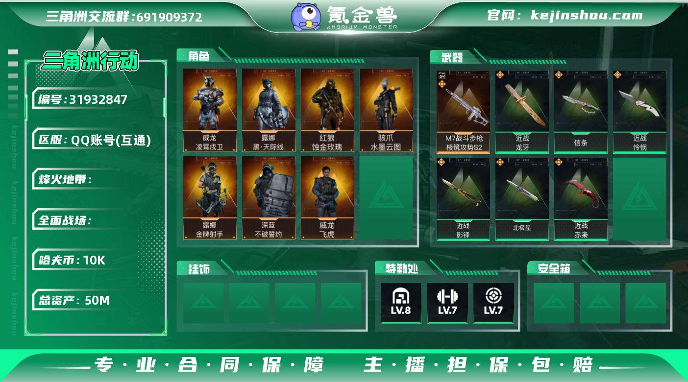 S1282总资产50M,哈夫币1w,典藏1 近战7 枪皮数量265,威龙-凌霄戍卫/露娜-黑天际线/红狼-蚀金玫瑰/骇爪-水墨云图/露娜-金牌射手/深蓝-不破誓约/威龙-飞虎/蜂医-送葬人无题密令,近战-龙牙/近战-信条/近战-北极星/近战-影锋/近战-怜悯/近战-赤枭,M7战斗步枪-棱镜攻势S2(优品S)战场等级29上等兵, 行动等级60黑鹰,安全箱等时效性道具请以游戏内数据为准,详情请看图