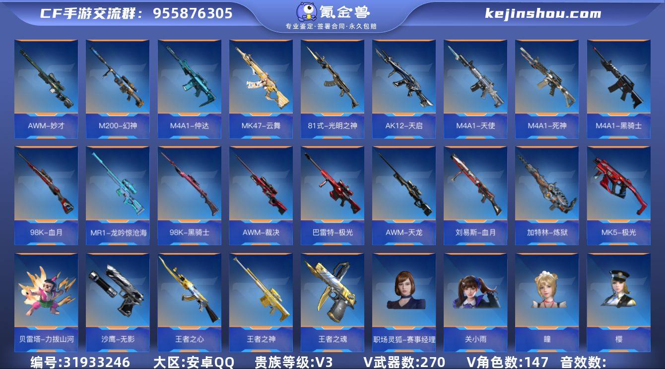 【FC-GEU8UF】【8王者-仲达妙才幻神仲康-3套王雷】安卓QQ,成人号:是,角色等级:110,实名:有修改人脸机会/实名是本人,段位:枪王SSS,VIP等级:V3,V武器数量:147,V角色数量:9,V总数量:270,王者武器数:7,万化数量:283,音效皮肤数:9, 【人物角色】关小雨,瞳,樱,幽灵刀锋-觉醒,堕天使,斯沃特,零-新生,刀锋-枪战王者,炽天使-X,零-水下丽影,职场灵狐-赛事经理, 【王者武器】王者之誉,王者之兽,王者之蝶,王者之心,王者之影,王者之魂,王者之神, 【带V枪械】激昂霸王枪,地狱烈炎,柯尔特-仲达,SCAR-幽暗骑士觉醒,SCAR-探星者,屠龙,AWM-天使,尼泊尔-机械纪元,M4A1-仲达,CZS2-血月,M4A1-天使,M14EBR-拂影,M4A1-死神,M4A1-黑骑士,47-云舞,CZS2-仲康,M4A1-千变,CBJ-MS-毒蜂,亡命之徒-鬼魅双生,双持GLOCK18-本初,KSG-孟获,气勇胆烈戟,嗜血金鲨,HK416-极光,甩棍-卧龙觉醒,思召剑,左轮-卧龙觉醒,QBZ97-浩瀚征途,MAC-10-孟获,蛮神巨斧,刘易斯-天使,双持沙鹰-元让,QBZ03-天罚,G3A3-衍神兵,81式-光明之神,USP-神工天巧,雷公鞭,啖睛矢,匕首-冰魂觉醒,QSZ92-冰魂觉醒,KSG-天使,AN94-盖,环刃-炫光掠影觉醒,98K-血月,M1887-幽冥玄喵觉醒,98K-黑骑士,AK12-天启,M12S-天公,M200-幻神,CZ75-策,巴雷特-极光,USP-仲康,MR1-龙吟惊沧海,AWM-妙才,AWM-裁决,威虎碎魂刀,AWM-天龙,Origin12-机变奇蛇觉醒,加特林-炼狱,气手枪-血月,刘易斯-血月,5-极光,贝雷塔-力拔山河,沙鹰-无影, 【音效卡】AK47-无影-电音,M4A1-仲达-现代战场,47-鼓龙-嘴炮,M4A1-雷神-电音,王者之影-现代战场,98K-星神-电音,王者之神-现代战场, 【万化皮肤】M4A1-黑骑士-现代金属,Origin12-机变奇蛇觉醒-千变,王者之心烟雾弹-Hea