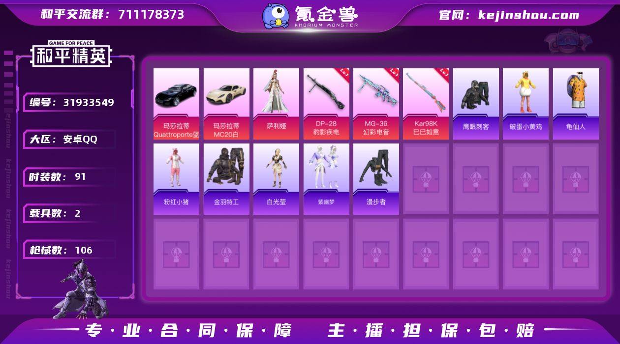 XS945【2粉3特效2载具】卡停可以正常玩游戏 安卓Q-2载具2粉装3特效枪7热门91套装106枪皮 28990热力值 1印记 历史超级王牌1星 【2载具】 玛莎拉蒂M白色 玛莎拉蒂Q蓝色 【2粉装】 萨利娅 伏羲圣卦 【3特效枪】 Kar98K-巳巳如意 (5级) MG-36-幻彩电音 (7级) DP-28-豹影疾电 (5级) 【7热门】 龟仙人 鹰眼刺客 金羽特工 粉红小猪 漫步者 破蛋小黄鸡 极速红龙 特训学院 猎鹰 青年教官 橘黑制服 红色运动 黄色运动 蓝色运动 黄色伏地魔 白色伏地魔 黑色伏地魔 冰川格斗者 竞技名士 深蓝色名流 酒红色名流 湖蓝色名流 黄色名流 猛禽 长空猛禽 漫步者 海岛探路者 雨林探路者 灼焰舞者 特战装甲 迎春赐吉 春日漫步 燃烧卡路里 沙漠毒蛇 鹰眼刺客 人气偶像 幻影武者 街头潮人 魅力单车 绮丽涂鸦 耀眼新星 野性战心 金羽特工 超能勇士 破晓战魂 荣耀 清新柠檬 缤纷果语 滨海厨神 龙魂突击队 冰川特警 极速红龙 麻辣教官 粉红小猪 破蛋小黄鸡 霓虹街区 萌黄之夏 战术大师 牛气冲天 耀粉歌者 飞行日记 SS21特训 萌趣咩咩 娇憨猪猪 SS22特训 光之冒险 SS23特训 异域银装飞行器 王牌教练 柠萌假日 SS24特训 龟仙人 涂山之恋 SS25特训 龙的传人 漫游都市 空岛之星 恋语绒绒 SS28特训 角色-白光莹 海盐绵绵冰 蝶变 星途旅人 角色-糖霜甜心 SS31特训 鱼渊荷华 燕燕于飞 紫幽梦 SS33特训 巳巳如意 SS32特训 蓝冰羽 大橘大利 元气之梦 SS34特训 游乐 薄荷星砂 AKM-破晓战魂 AKM-涂鸦街区 AKM-龙的传人 M16A4-幻世战舞者 M16A4-冰河战士 SCAR-L-夜灯 SCAR-L-玉兔迎春 SCAR-L-星途旅人 SCAR-L-海盐豹豹 M416-蓝色火焰 M416-糯团青竹 GROZA-影袭 GROZA-彩虹符号 AUG-耀粉歌者 AUG-天降萌叽 AUG-紫晶流影 QBZ-彩虹符号 M762-彩虹符号 M762-天降萌叽 Mk47-乌木金纹 G36C-星穹咏叹调 营地号:939407088