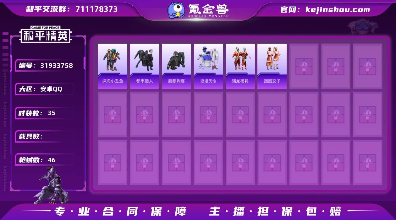 DSH2300【身法号深海小丑鱼,都市猎人,浪漫天命,暗影哥特】安卓手Q-2特效枪-35套装-46枪皮-0王牌印记-不朽星钻Ⅲ-12510热力值【2特效枪】AA12-G-萌骑幻想[3级],Mk14-福马献瑞[5级]【4稀有】深海小丑鱼,都市猎人,浪漫天命,暗影哥特【1飞行器】齐天大圣飞行器【75其它衣服和枪皮】快乐星愿,竞技名士,狙击之神,SS36特训,瑞龙福将,特训学院,白色伏地魔,雨过天青,潮流炫酷,冷焰舞者,天籁歌者,SS37特训,SS23特训,鹰眼刺客,SS24特训,麻辣教官,青年教官,SS17特训,SS27特训,马上来财,虎虎生威吉莉,SS22特训,黑色伏地魔,海岛探路者,团圆交子,福马献瑞,湖蓝色名流,暮夜私语,长空猛禽,红釉青花,福星高照,AKM-虎虎生威,AA12-G-雨过天青,DP-28-彩虹符号,平底锅-光之冒险,UZI-影袭,AC-VAL-天降萌叽,M416-蓝色火焰,Vector-生命誓言,AC-VAL-乌木金纹,S12K-瑞龙福将,AKM-星之彼岸,DBS-第五大道,UMP45-蓝色火焰,UZI-炫彩节奏,PKM-雨过天青,AMR-雨过天青,AKM-生命誓言,平底锅-瑞龙福将,QBZ-彩虹符号,Win94-瑞龙福将,蜜獾-启元战纹,SCAR-L-红色方程式,UMP45-夜灯,S686-生命誓言,MG3-火熔核心,MG-36-薄荷星砂,M249-星之彼岸,ARX-天马神君,S12K-破晓战魂,AKM-彩虹符号,P90-紫矿核心,AUG-耀粉歌者,Mini14-香桃花海,MG3-乌木金纹,GROZA-福马献瑞,莫辛纳甘-乌木金纹,沙漠之鹰-雨过天青,M16A4-雨过天青,M762-瑞龙福将,MG3-瑞龙福将,M416-糯团青竹,12-乌木金纹,SLR-乌木金纹,G36C-乌木金纹