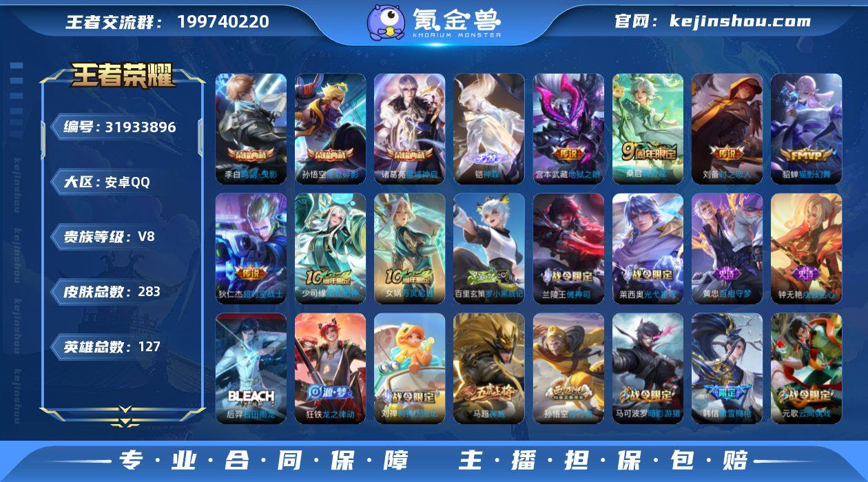 可换绑【店长推荐精品号·李白典藏·曜无双·宫本暃双珍品·马年貂蝉·马超琥珀纪元·李逍遥·关羽武圣·青龙志·朱雀志·多传说限定号】11按键,2星传说,21王者印记,满级铭文,可二次CD17875,安卓Q-V8-316皮肤-1典藏皮肤-1无双-2珍品传说-16传说-82史诗【英雄全皮】:空空儿全皮【荣耀典藏】:李白鸣剑曳影【无双皮肤】:曜器灵螭龙剑【珍品传说】:宫本武藏黑崎一护,暃朽木白哉【星元皮肤】:宫本武藏幽冥之眼,孙尚香未来机甲【传说皮肤】:貂蝉神骥聚万邦,后羿神树通天,大司命死亡执政官,桑启鸣野蒿,亚连落雪白狼,马超琥珀纪元,澜逐花归海,露娜霜月吟,赵云淬星耀世,曜李逍遥 ,虞姬启明星使,关羽武圣,李信一念神魔,干将莫邪久胜战神,宫本武藏地狱之眼,孙悟空地狱火【限定皮肤】:白起狰,姜子牙天穹之誓,狄仁杰阴阳师,虞姬凯尔特女王,赵云皇家上将,墨子神迹守卫,嬴政白昼王子,鲁班七号狮舞东方,庄周高山流水,高渐离死亡摇滚,高渐离玩趣恶龙,钟无艳王者之锤,孙膑妖精王,扁鹊炼金王,芈月重明,芈月幻夜卜梦,吕布猎兽之王,元歌云间偶戏,元歌无心,夏侯惇朔风刀,曹操烛龙,典韦穷奇,狄仁杰魔术师,狄仁杰万华元夜,达摩星际陆战队,达摩沙漠行僧,项羽海滩派对,老夫子醍醐杖,老夫子航海奇遇记,关羽冰锋战神,关羽武圣,程咬金演武夺筹,兰陵王金庭之子,花木兰默契交锋,亚瑟潮玩骑士王,孙悟空至尊宝,牛魔御旌,后羿圣弓游侠,李元芳云中旅人,虞姬启明星使,钟馗神迹守卫,钟馗驱傩正仪,杨玉环遇见飞天,干将莫邪冰霜恋舞曲,干将莫邪真爱魔法,雅典娜黎明之约,蔡文姬繁星吟游,太乙真人饕餮,太乙真人华丽摇滚,鬼谷子原初探秘者,鬼谷子五谷丰年,黄忠火炮绅士,铠青龙志,苏烈千军破阵,百里玄策原初追逐者,百里守约朱雀志,弈星混沌棋,梦奇顽趣,沈梦溪大漠名商,明世隐...