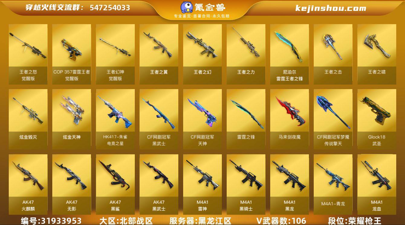 DYCF083【111V 王者幻神 SL白虎 8烈龙】【等级】100【区服】黑龙江区【VIP】2【英雄角色】5【英雄武器】106【王者级武器】QBZ-03-王者蔷薇-觉醒版 COP 357-雷霆王者-觉醒版 闪光弹-雷霆王者-觉醒版 雷霆王者之锋 王者幻神-觉醒版 高爆手雷-雷霆王者 王者之幻 王者之怒-觉醒版 王者之力 王者之翼 王者之击 王者之啸【炫金级武器】炫金骑士 炫金天神 炫金毁灭【英雄级角色】葵 樱 魅影 炫 幻面灵狐【英雄级武器】炽芒蝶刃 M4A1-猎神 HK417-朱雀-电竞之星 M4A1-青龙 屠龙-电竞之星 9A91-烈火 9A91-烈火 9A91-烈火 烟雾弹-荣耀世冠EP 闪光弹-竞技荣光 烟雾弹-竞技荣光 高爆手雷-竞技荣光 马来剑-夜魔 烟雾弹-夜魔 高爆手雷-夜魔 闪光弹-夜魔 烟雾弹-幻灵 烟雾弹-幻灵 天神-CF网剧冠军 黑武士-CF网剧冠军 擎天-CF网剧冠军 Scar Light-白虎 USP-雷暴 高爆手雷-雷暴 烟雾弹-雷暴 闪光弹-雷暴 高爆手雷-雷暴 烟雾弹-雷暴 闪光弹-雷暴 高爆手雷-雷暴 烟雾弹-雷暴 闪光弹-雷暴 AK47-火麒麟 屠龙 沙鹰-修罗 汤姆逊-烈龙 屠龙 AK47-火麒麟 汤姆逊-烈龙 屠龙 屠龙 M4A1-龙血 斩神刀-雷暴 AA-12-雷霆 高爆手雷-雷暴 烟雾弹-雷暴 闪光弹-雷暴 AA-12-雷霆 AK47-黑鲨 AWM-裁决 加特林-炼狱 QBZ03-金色蔷薇 加特林-炼狱 M4A1-黑龙 麒麟刺 M4A1-龙血 雷霆之锋 高爆手雷-雷霆 烟雾弹-雷霆 闪光弹-雷霆 AWM-裁决 9A91-烈火 AK12-天启 汤姆逊-烈龙 AK47-无影 汤姆逊-烈龙 AN94-超新星 M4A1-武圣 Glock18-武圣 AK47-黑武士 屠龙 QBZ03-金色蔷薇 barrett-金色蔷薇 屠龙 M4A1-黑骑士 M4A1-黑骑士 QBZ03-金色蔷薇 barrett-金色蔷薇 barrett-金色蔷薇 擎天 沙鹰-修罗 AK12-天启 汤姆逊-烈龙 汤姆逊-烈龙 汤姆逊-烈龙 麒