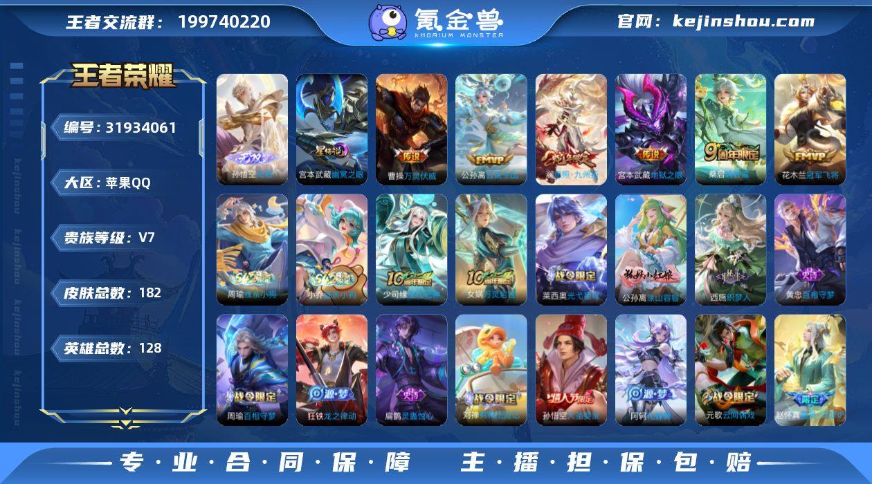 贵族8/皮肤283/典藏1/传说18/史诗82/英雄126/李信全皮/戈娅全皮/九霄神辉/幽冥之眼/神树通天/愿照·九州拓/幻光神枪/鸣野蒿/鹤归松栖(云缨)/妄想实况/山海·苍雷引/山海·炽霜斩/神器·狴犴令/无双飞将/挚爱之约/寅虎·赤拳/寅虎·瑞焰/启明星使/云鹰飞将/一念神魔/地狱之眼/超时空战士-狄仁杰/天穹之誓(s36)/阴阳师/寅虎·御盾/皇家上将/引擎之心/百木心枪/蔷薇恋人/高山流水/超时空战士-钟无艳/奇幻香踪/夜都怪侠/幻夜卜梦/无心/匿光决锋者/落雪兰心/魔术师/沙漠行僧(s26)/海滩派对/一生所爱/傲雪梅枪/午后时光/金庭之子(s27)/至尊宝/孙行者/匿光侦查者/云中旅人(s29)/潮玩骑兵/单词大作战/黎明之约/五谷丰年/火炮绅士/千军破阵(s25)/玉兔公主/大漠名商(s28)/吟游魔法/擒涛扼浪(s31)/电玩高手/时之祈愿-云中君/梁祝/暖冬·兔眠/玲珑珍味/探海日志(s32)/匿光追影者/海盐诗旅(s30)/星界游侠/驭风魔法/女武神/鹤归松栖(赵怀真)/江河有灵/古海寻踪(s33)/蒙恬荣光圣徽/鬼谷子天穹祈灯(S34)/龙武盛年/剑破天穹(s35)/熔金海岸/噬灭天穹(s37)/谧流熔炉/虚灵犬护/荣光之誓/星界战将/九幽镇关/线条小狗-周瑜/紫霞仙子/暗夜猫娘/嘻哈天王/未来纪元-赵云/圣诞恋歌/冰雪圆舞曲/偶像歌手/地狱岩魂/鬼剑武藏/水果甜心/暗夜贵公子/摇滚巨星/魅力维加斯/女仆咖啡/金属风暴/圣诞狂欢/绅士熊喵/幽灵船长/千年之狐/末日机甲-吕布/乱世虎臣/水晶猎龙者/德古拉伯爵/乘风破浪/缤纷独角兽/暗隐猎兽者/黄金分割率/心灵战警/心灵骇客/特工魅影/曙光守护者/舞动绿茵/天才门将/逐浪之夏/功夫厨神/星夜王子/节奏热浪/猫狗日记-孙策/箭羽风息/鹰眼统帅/晚萤/热力回旋/赏金猎手/千筹问战/电玩·爆裂旋风/化蝶舞/龙之律动/灵蛊蚀心/百相守梦-黄忠/巫礼祀神/教廷特使/街头霸王/哥特玫瑰/爱心护理/大发明家/白执事/忍·炎影/红桃皇后/星际陆战队(程咬金)/白...