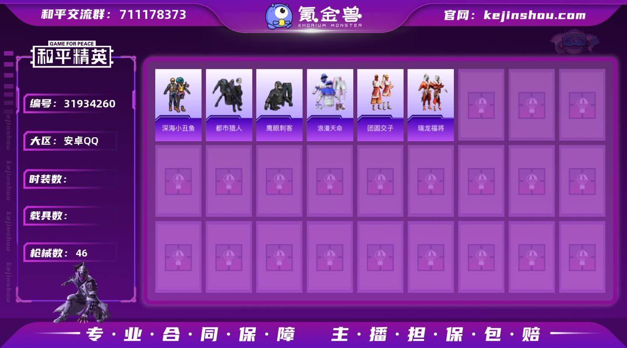 DSH2300【身法号深海小丑鱼,都市猎人,浪漫天命,暗影哥特】安卓手Q-2特效枪-35套装-46枪皮-0王牌印记-不朽星钻Ⅲ-12510热力值【2特效枪】AA12-G-萌骑幻想[3级],Mk14-福马献瑞[5级]【4稀有】深海小丑鱼,都市猎人,浪漫天命,暗影哥特【1飞行器】齐天大圣飞行器【75其它衣服和枪皮】快乐星愿,竞技名士,狙击之神,SS36特训,瑞龙福将,特训学院,白色伏地魔,雨过天青,潮流炫酷,冷焰舞者,天籁歌者,SS37特训,SS23特训,鹰眼刺客,SS24特训,麻辣教官,青年教官,SS17特训,SS27特训,马上来财,虎虎生威吉莉,SS22特训,黑色伏地魔,海岛探路者,团圆交子,福马献瑞,湖蓝色名流,暮夜私语,长空猛禽,红釉青花,福星高照,AKM-虎虎生威,AA12-G-雨过天青,DP-28-彩虹符号,平底锅-光之冒险,UZI-影袭,AC-VAL-天降萌叽,M416-蓝色火焰,Vector-生命誓言,AC-VAL-乌木金纹,S12K-瑞龙福将,AKM-星之彼岸,DBS-第五大道,UMP45-蓝色火焰,UZI-炫彩节奏,PKM-雨过天青,AMR-雨过天青,AKM-生命誓言,平底锅-瑞龙福将,QBZ-彩虹符号,Win94-瑞龙福将,蜜獾-启元战纹,SCAR-L-红色方程式,UMP45-夜灯,S686-生命誓言,MG3-火熔核心,MG-36-薄荷星砂,M249-星之彼岸,ARX-天马神君,S12K-破晓战魂,AKM-彩虹符号,P90-紫矿核心,AUG-耀粉歌者,Mini14-香桃花海,MG3-乌木金纹,GROZA-福马献瑞,莫辛纳甘-乌木金纹,沙漠之鹰-雨过天青,M16A4-雨过天青,M762-瑞龙福将,MG3-瑞龙福将,M416-糯团青竹,12-乌木金纹,SLR-乌木金纹,G36C-乌木金纹