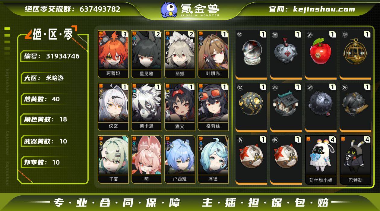 冒险等级:60 总黄数:40 五星角色数:18 菲林底片数量:542 菲林数量:150 加密母带数量:0 3命珂蕾妲,2命星见雅,2命丽娜,1命叶瞬光,1命仪玄,1命莱卡恩,1命猫又,1命格莉丝,0命千夏,0命照,0命卢西娅,0命席德,0命柚叶,0命扳机,0命伊芙琳,0命耀嘉音,0命浅羽悠真,0命「11号」 6命真斗,6命潘引壶,6命波可娜,6命赛斯,6命露西,6命苍角,6命派派,6命比利,6命本,6命安比,6命妮可,6命安东,6命可琳 1精云霓孤光,1精机巧心种,1精狸法七变化,1精青溟笼舍,1精心弦夜响,1精霰落星殿,1精啜泣摇篮,1精拘缚者,1精燃狱齿轮 4精艾丝弥小姐,4精巴特勒,3精芽芽,3精狮耶,1精墨丘利,1精罗宾,1精咔嚓仔,1精格列佛探员,1精赤红莫库斯,1精鲨牙布 白心旧影,狡黠甜心,墨形影踪,晴空化狸,晴澜双迹套装,漪光夜曲 卖家说:有仪玄柚叶皮肤,单手机