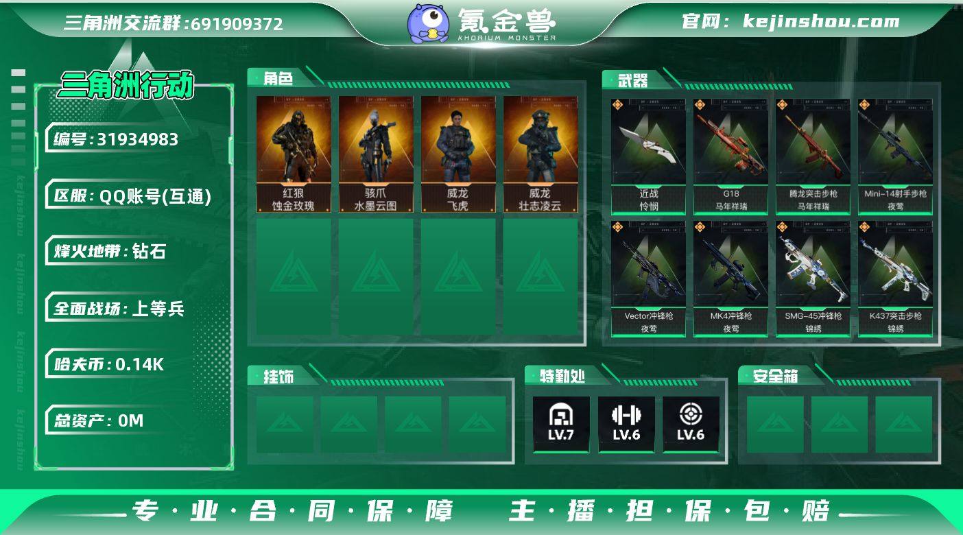 实名: 不可修改 烽火地带段位: 钻石 全面战场段位: 上等兵 总资产: 233 哈夫币: 142 干员外观: 红狼-蚀金玫瑰,威龙-壮志凌云(S3),骇爪-水墨云图,威龙-飞虎 传说武器皮肤: M4A1突击步枪-蚀金玫瑰,近战-怜悯,ASh-12战斗步枪-怜悯,M7战斗步枪-怜悯,SCAR-H战斗步枪-铁艺苍穹,SR-25射手步枪-水墨云图,SCAR-H战斗步枪-水墨云图,AS Val突击步枪-蛇年祥瑞,AK-12突击步枪-夜鹰,G18-飞虎,725双管霰弹枪-送葬人-无题密令,M4A1突击步枪-阿米娅,CAR-15突击步枪-阿米娅,AWM狙击步枪-捞点薯条,腾龙突击步枪-捞点薯条,93R-捞点薯条,AK-12突击步枪-特斯拉线圈,SR-3M紧凑突击步枪-特斯拉线圈,UZI冲锋枪-特斯拉线圈,Vector冲锋枪-能天使-午夜邮差,SCAR-H战斗步枪-启航,K437突击步枪-几何解构,M250通用机枪-几何解构,SR-9射手步枪-几何解构,KC17突击步枪-电锯惊魂,腾龙突击步枪-马年祥瑞,G18-马年祥瑞,Vector冲锋枪-夜莺,MK4冲锋枪-夜莺,Mini-14射手步枪-夜莺,.357左轮-缄花,SR-25射手步枪-缄花,M14射手步枪-缄花,SMG-45冲锋枪-锦绣,K437突击步枪-锦绣,AKM突击步枪-锦绣 亮点: 【优质装备】:近战-怜悯