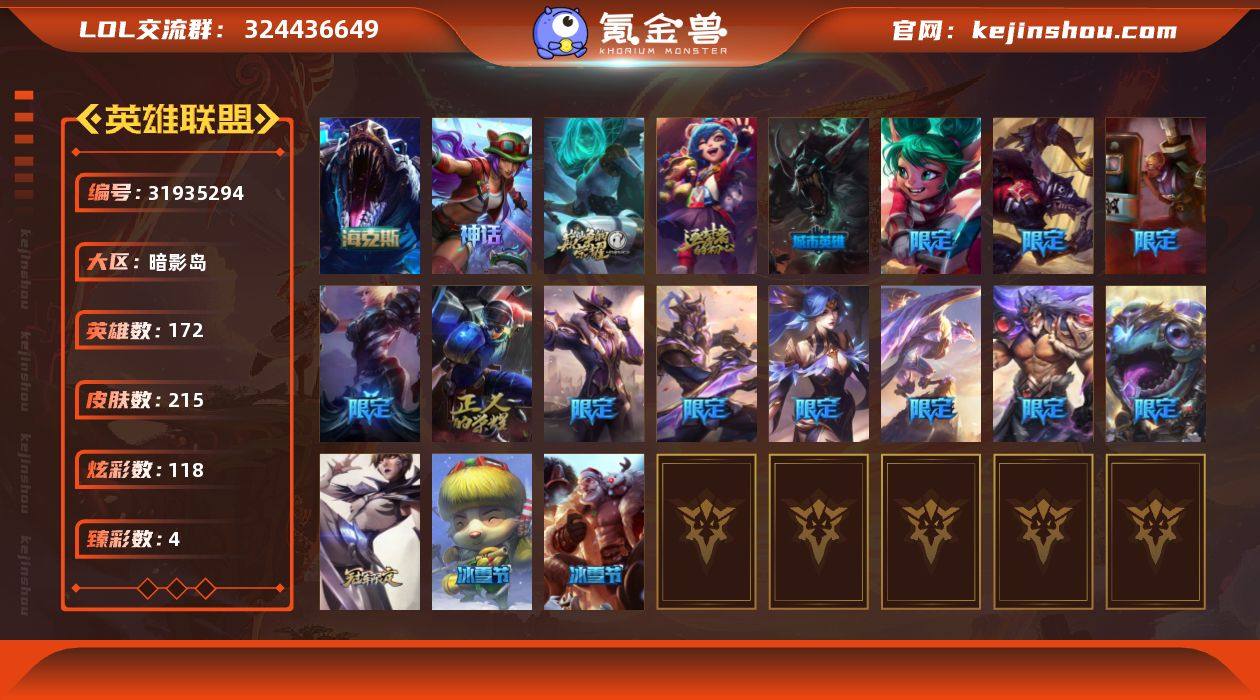 【LOLZ1280】172英雄/215皮肤/4神话/20限定/4臻彩/118炫彩/21传说/45史诗/未定级/10周年 安妮/源代码 乐芙兰/十五周年纪念 希维尔/海克斯 雷克顿/赵云 子龙 炫金将军/灵魂莲华 亚索 霜见之时/可爱可爱粉红红 布里茨/魔女 阿卡丽 虚荣/圣诞开心鬼 提莫/圣诞老人 酒桶/圣诞老人 布隆/冠军之刃 锐雯 2016/S8 IG 卡密尔/胜利凤凰 艾尼维亚/胜利之王 泰达米尔/胜利巨口 克格莫/胜利女神 娑娜/胜利剑圣 易/胜利之运 崔斯特/胜利女神-菲奥娜/鬼影重重 魔腾/魅惑女巫 伊莉丝/暗影 沃里克/波比的巧克力工坊/都铎王朝 图奇/防暴士兵 辛吉德/防暴天使 凯尔/铁哥们儿 奥拉夫/魔幻卡牌 崔斯特/恶魔男爵 瑞兹/黑夜使者 索拉卡/约德尔国队长 提莫/幻灵战斗队长 厄运小姐/恶魔之刃 泰达米尔/黯晶凤凰 艾尼维亚/冰霜之刃 艾瑞莉娅/太空律动 “猫猫” 布里和里茨/源计划:泯灭 雷克顿/神王 盖伦/黎明使者 锐雯/星之守护者 阿狸/宇航员 诺提勒斯/女校长 菲奥娜/灌篮高手 德莱厄斯/蔷薇绅士 杰斯/暗星尊 烬/星之守护者 金克丝/西部魔影 卢锡安/摄魂男爵 弗拉基米尔/圣光审判 凯尔/天人合一 易/侍魂 易/圣洁化身 索拉卡/兔宝宝 提莫/女船长 厄运小姐/少林武僧 贾克斯/死神 卡尔萨斯/侏罗纪化石 科加斯/小小骑士 阿木木/贵族血统 萨科/武动巅峰 萨科/战争血统 蒙多/绝代智将 斯维因/驯龙大师 斯维因/抵抗军天使 凯特琳/霸天巨兽 墨菲特/蓝焰梦魔 魔腾/符文战神 雷克顿/龙骑统帅 嘉文四世/腥红之月 伊莉丝/灵魂烈焰 布兰德/至高之拳 李青/战地机甲 斯卡纳/大夏武士 潘森/冰川勇者 伊泽瑞尔/死亡领主 莫德凯撒/铁甲雄心 盖伦/兔女郎 锐雯/侏罗纪化石 克格莫/暗影妖狐 阿狸/皇家守卫 菲奥娜/铁血帝皇 德莱厄斯/生化骑士 德莱厄斯/全金属狂潮 杰斯/亚特兰蒂斯 辛德拉/灰烬领主 奥瑞利安·索尔/驯龙女巫 婕拉/腥红之月 亚索/弗雷尔卓德 塔莉垭/源...