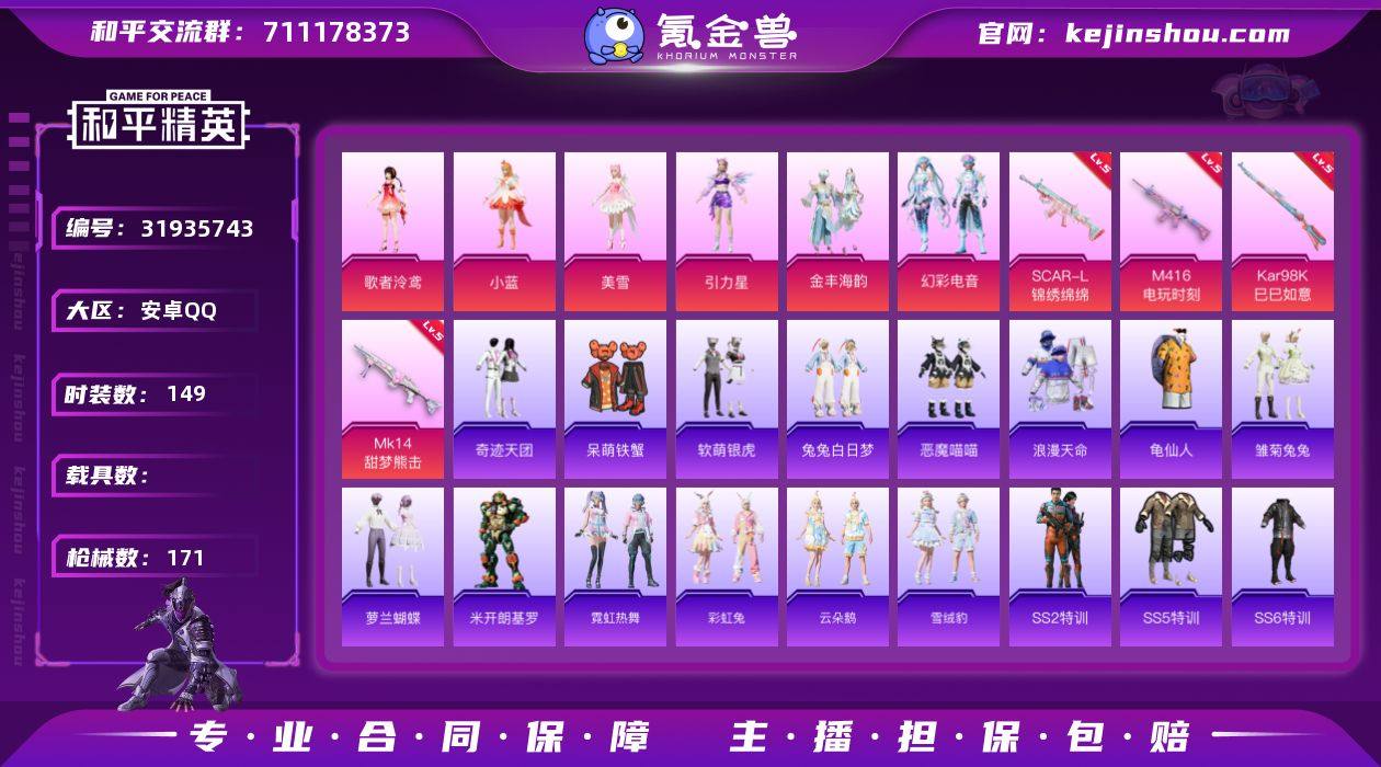 安卓 手Q-6粉装-4特效枪-0载具-2粉色飞行器-57865热力值-7王牌印记-149套装-171枪皮 【热门品类】:套装-浪漫天命,套装-龟仙人 【粉色套装】:角色-歌者泠鸢,角色-小蓝,角色-美雪,角色-引力星,粉装-金丰海韵,粉装-幻彩电音 【粉色枪皮等级】:SCAR-L-锦绣绵绵(五级),M416-电玩时刻(五级),Kar98K-巳巳如意(五级),Mk14-甜梦熊击(五级) 【粉色枪皮】:SCAR-L-锦绣绵绵,M416-电玩时刻,Kar98K-巳巳如意,Mk14-甜梦熊击 【粉色飞行器】:齐天大圣飞行器,庄周梦蝶飞行器 【粉色降落伞】:暗夜玫瑰降落伞,天之羽翼降落伞,橘柚倾心降落伞,垂柳戏鸭降落伞,彩虹甜喵降落伞,旋转彩虹降落伞,绝色倾城降落伞,江南烟雨降落伞,精灵梦叶罗丽降落伞 【稀有套装】:套装-龟仙人,套装-雏菊兔兔,套装-萝兰蝴蝶,角色-米开朗基罗,套装-霓虹热舞,套装-彩虹兔,套装-云朵鹅,套装-雪绒豹 【稀有枪皮】:AKM-夜灯,AKM-星兔领航员,AKM-春暖花开,AKM-环太平洋,AKM-生命誓言,AKM-破晓战魂,AKM-缤纷海域,AKM-萌趣颜团子,AKM-阿狸红,AKM-龙的传人,M16A4-幻世战舞者,M16A4-甜心亚梦,M16A4-红色方程式,M16A4-蓝色火焰,M16A4-魔法学院,SCAR-L-炫彩节奏,SCAR-L-玉兔迎春,SCAR-L-红色方程式,M416-夜灯,M416-糯团青竹,M416-红色方程式,M416-蓝色火焰,GROZA-异彩先驱,GROZA-彩虹符号,GROZA-治愈之星,AUG-耀粉歌者,QBZ-彩虹符号,QBZ-飞驰魅影,M762-天降萌叽,M762-彩虹甜喵,M762-拳皇97,M762-牛气冲天,M762-瑞龙福将,M762-云朵鹅,AC-VAL-天降萌叽,AC-VAL-甜心亚梦,蜜獾-垂柳戏鸭,蜜獾-娇憨猪猪,蜜獾-绯穹魔姬,Famas-墨龙九天,UZI-天降萌叽,UZI-娇憨猪猪,UZI-炫彩节奏,UZI-红色方程式,UMP45-夜灯,UMP45-炫光之旅,UMP45-生命誓言,UMP45-蓝色火焰,Vector-焰鹰斗篷,Vector-彩虹符号...