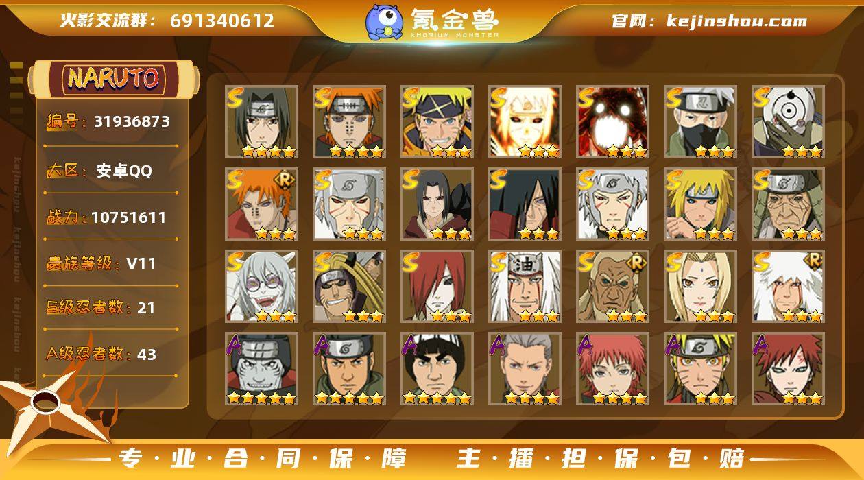 实名:不可二次实名 贵族等级:V11 战力值:10751611 S忍数:21 A忍数:43 四星宇智波鼬「须佐能乎」,四星佩恩「天道」,三星漩涡鸣人·宇智波佐助,三星波风水门「九喇嘛连结」,三星漩涡鸣人「暴怒·第六尾」,三星旗木卡卡西「须佐能乎」,三星宇智波斑「白面具」,三星佩恩·天道「超」,三星千手扉间「秽土转生」,三星宇智波鼬「秽土转生」,三星宇智波斑「秽土转生」,三星千手扉间,三星波风水门「秽土转生」,三星猿飞日斩「秽土转生」,三星药师兜「仙人模式」,三星金角/银角「秽土转生」,三星长门「秽土转生」,三星自来也,三星艾「三代目雷影」,三星纲手,三星自来也「舞之豪杰」 五星干柿鬼鲛,五星猿飞阿斯玛,五星迈特凯,四星飞段,四星蝎,三星漩涡鸣人「仙人模式」,三星我爱罗「疾风传」,二星小南「神驹佑将」,二星迈特凯「青春爆炸」,二星桃地再不斩「秽土转生」,二星神农「羁绊」,二星宇智波泉奈,二星角都「秽土转生」,二星李洛克「忍界大战」,二星旗木卡卡西「幻之真容」,二星不缘,二星宇智波止水,二星波风水门「青年」,二星奇拉比「忍界大战」,二星黑土「博人传」,二星猿飞阿斯玛「七夕限定」,二星宇智波佐助「须佐能乎」,二星迪达拉「秽土转生」,二星旗木卡卡西「忍界大战」,二星猿飞木叶丸「博人传」,二星漩涡鸣人「九尾查克拉」,二星千代「近松十人卫」,二星药师兜「半蛇斗篷」,二星地陆,二星我爱罗「忍界大战」,二星秋道丁次「忍界大战」,二星大蛇丸「晓」,二星猿飞阿斯玛「秽土转生」,二星照美冥「五代目水影」,二星宇智波佐助「万花筒写轮眼」,二星奇拉比,二星绝,二星旗木卡卡西「万花筒写轮眼」,二星角都「地怨虞」,二星飞段「死司凭血」,二星小南,二星宇智波鼬,二星桃地再不斩 卖家说:70片舍人,80片半藏