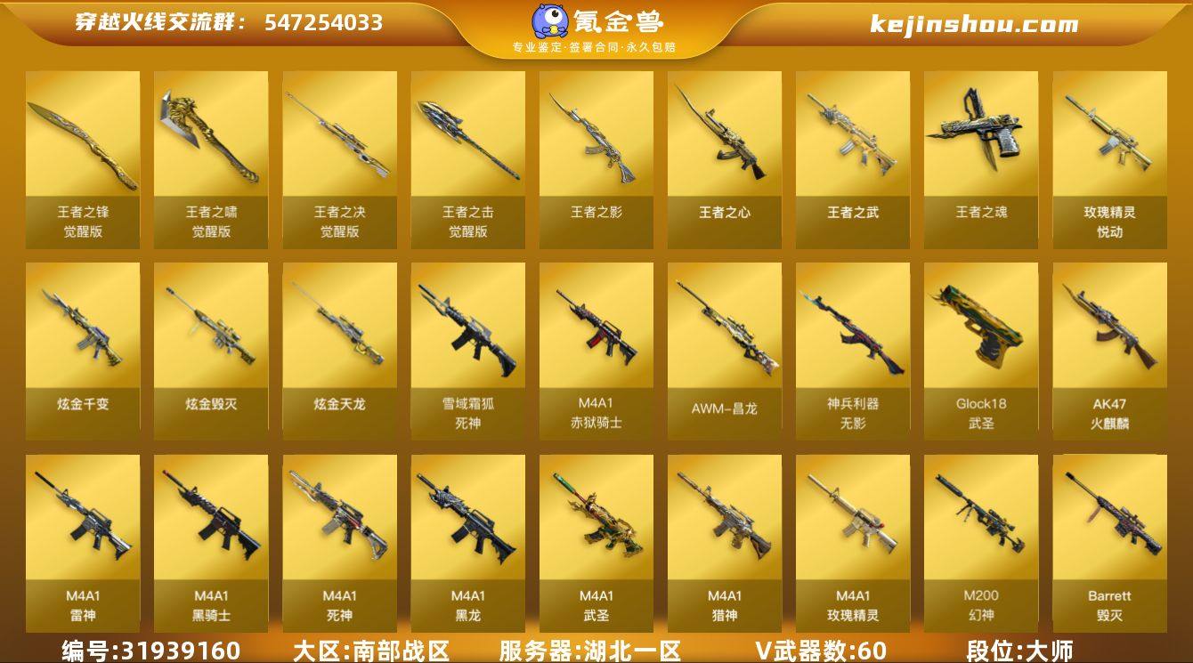 湖北一区-70V-11王者武器数-3炫金武器数 【热门武器】:QBZ03-金色蔷薇,HK417-朱雀,M200-幻神,M4A1-黑骑士,汤姆逊-烈龙*6,RPK-盘龙*3,加特林-炼狱*5,羊驼玩偶,沙鹰-修罗*4 【王者炫金武器】:王者之武,玫瑰精灵-悦动,王者之影,王者之心,王者之魂,炫金千变,炫金毁灭,炫金天龙,王者之魄高爆手雷,王者之魄闪光弹 【音效卡】:M4A1-雷神音效卡,M4A1-黑龙音效卡,Barrett-毁灭音效卡,Barrett-极光音效卡,死神-雪域霜狐-怀旧音效卡 【皮肤】:雷神-虎将,雷神-耀金皮肤,火麒麟-轻羽皮肤,火麒麟-心动糖果,毁灭-暗月*2,毁灭耀金皮肤,M4A1-千变-孔明皮肤,M4A1-黑龙-361,黑骑士-暗月,黑骑士耀金皮肤,极光-能量核心,修罗-能量核心,修罗-星空,屠龙-荣耀之锋 【角色】:樱,战地猎狐,雪域霜狐,奇洋探员,乔伊教练,修道士,云海玲珑,风暴女,嘉年华灵狐,娟娟,兰-海滩派对,零-水下丽影,灵狐者-黄金海岸,龙儿,麻雀,曼陀罗-X,潘多拉-X,斯沃特-X,兔囡囡 【人偶武器】:M4A1-雷神-精英刀锋,迷你救赎猎手,巴雷特-零-水下丽影,迷你地狱终结者,AWM-灵狐-15周年嘉年华,COP-旗袍,迷你生化手雷,生化手雷-机甲核心,迷你艾比 【暴走生化】:超级对讲机 【挑战大师】:试炼破坏者III,神圣爆裂者-末日III 【英雄级武器】:AK47-火麒麟*4,M4A1-黑龙,M4A1-雷神,M4A1-黑骑士,M4A1-死神,AK12-天启,AN94-超新星,M4A1-武圣,HK417-朱雀,无影-神兵利器,死神-雪域霜狐,M4A1-玫瑰精灵,QBZ03-金色蔷薇,M4A1-猎神,Barrett-毁灭*2,Barrett-极光*2,AWM-裁决,M200-幻神,Barrett-朱雀,Barrett-金色蔷薇*2,王者之决-觉醒版,RPK-盘龙*3,加特林-炼狱*5,汤姆逊-烈龙*6,AA-12-雷霆*2,沙鹰-修罗*4,沙鹰-天神*3,Glock18-武圣,屠龙*2,擎天*3,麒麟刺,王者之锋-觉醒版,王者之啸-...
