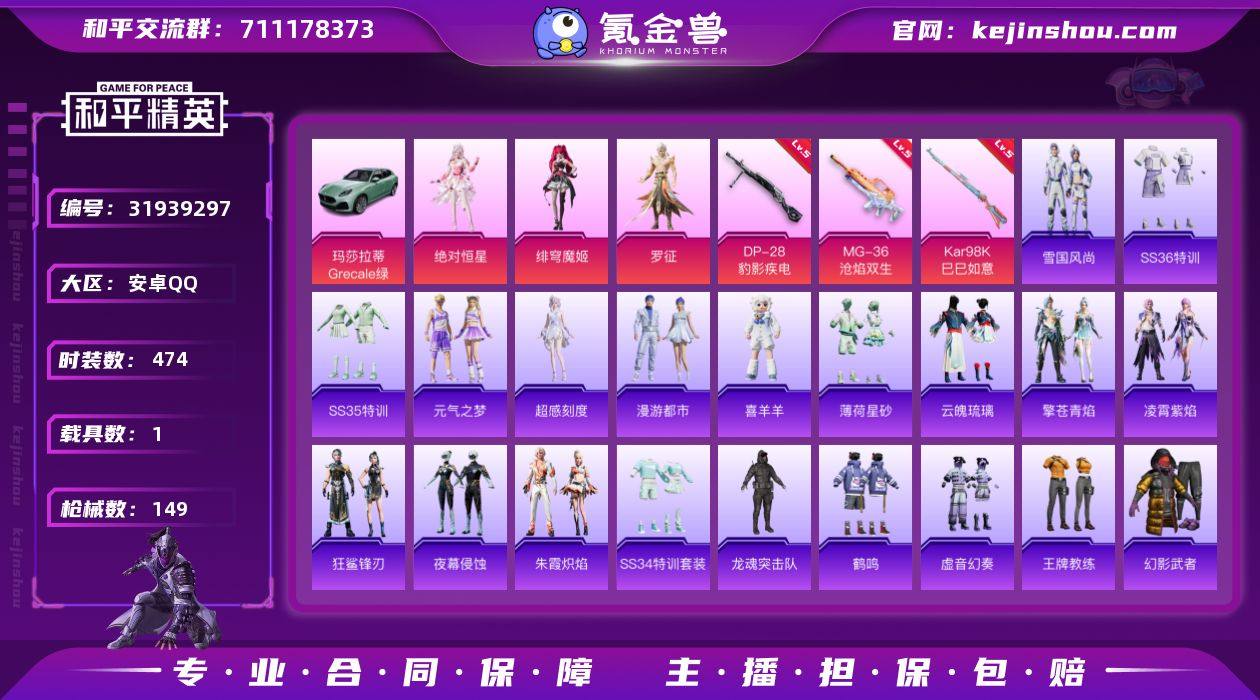 实名:不可二次实名 是否支持人脸包赔:支持 粉装数量:3 特效枪数量:3 载具数:1 时装数:474 枪械数:149 绝对恒星,绯穹魔姬,罗征 五级DP-28-豹影疾电,五级MG-36-沧焰双生,五级Kar98K-巳巳如意 玛莎拉蒂Grecale(薄荷绿) 雪国风尚,SS36特训,炫彩糖果,SS35特训,超感刻度,元气之梦,漫游都市,喜羊羊,薄荷星砂,云魄琉璃,狂鲨锋刃,凌霄紫焰,擎苍青焰,SS34特训套装,夜幕侵蚀,朱霞炽焰,缤纷果语,滨海假日,冰河战士,白糯汤圆,彩虹兔,长空猛禽,顶瓜瓜,蝶变,都市魅力,都市漫游者,电音精灵,飞驰魅影,福星高照,飞行日记,格斗先锋,光之冒险,海岛探路者,鹤鸣,虎虎生威吉莉,黄色名流,幻影武者,酒红色名流,橘黑制服,娇憨猪猪,竞技名士,吉莉礼服,极速红龙,街头潮人,街头风暴,快乐星愿,空投萌叽,蓝彩潮人,龙的传人,龙魂突击队,猎鹰,浪漫假日,龙腾端午,兰香蝶语,冷焰舞者,乐游熊熊,猛禽,萌黄之夏,魅力单车,麻辣教官,蜜露汐语,萌趣咩咩,萌趣颜团子,霓虹极客,怒火燎原,霓虹热舞,柠萌假日,牛气满满,破蛋小黄鸡,破晓战魂,轻风白浪,绮丽涂鸦,青年教官,青玉碎影,云朵鹅,瑞龙福将,人气偶像,深蓝色名流,SS12特训,SS13特训,SS14特训,SS17特训,SS18特训,SS19特训,SS20特训,SS21特训,SS22特训,SS23特训,SS24特训,SS25特训,SS29特训,SS30特训套装,SS31特训套装,SS32特训套装,SS33特训套装,SS9特训,甜蜜告白,特殊使命,特训学院,团圆交子,田园牧歌,特战装甲,完美偶像,王牌教练,雪绒豹,夏日音浪,醒狮腾龙,香桃花海,虚音幻奏,异彩先驱,耀粉歌者,音速流光,玉兔迎春,异域银装,战地督导,灼焰舞者 炫彩糖果飞行器,梦幻火箭飞行器,绝对恒星降落伞,炫彩糖果降落伞,喜羊羊与灰太狼降落伞,绯穹魔姬降落伞,幻彩电音降落伞,环太平洋降落伞,冷漠罗丽降落伞,深海曼妙降落伞,天之羽翼降落伞,旋转彩虹降落伞 卖家说:连体号王者荣耀也有传说皮肤荣耀水晶也快出了