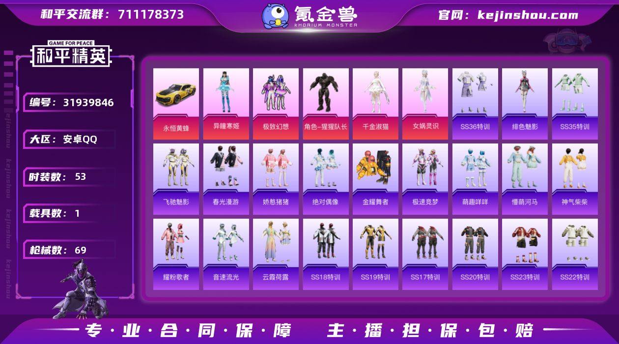 【和平精英】5粉装,3特效枪,1载具,历史最高段位:超级王牌6星 王牌印记9次 热力值:46865,127套装,170枪械,164装备,91战备;套装:套装-极致幻想,角色-猩猩队长,角色-异瞳寒姬,角色-千金淑猫,角色-女娲灵识,套装-特训学院,套装-猎鹰,套装-青年教官,套装-橘黑制服,套装-红色运动,套装-黄色运动,套装-蓝色运动,套装-黄色伏地魔,套装-白色伏地魔,套装-黑色伏地魔,套装-竞技名士,套装-深蓝色名流,套装-酒红色名流,套装-湖蓝色名流,套装-黄色名流,套装-猛禽,套装-长空猛禽,套装-蓝色守护者,套装-旭日情侣,套装-六六大吉,套装-冷焰舞者,套装-灼焰舞者,套装-战地督导,套装-特殊使命,套装-滨海假日,套装-完美偶像,套装-人气偶像,套装-幻影武者,套装-蓝彩潮人,套装-魅力单车,套装-绮丽涂鸦,套装-竞技达人朋克,套装-破晓战魂,套装-都市魅力,套装-荣耀,套装-幻世战舞者,套装-金耀舞者,套装-甜蜜熊情侣,套装-青涩时光,套装-龙魂突击队,套装-冰川特警,套装-元素星魂,套装-极速红龙,套装-麻辣教官,套装-破蛋小黄鸡,套装-鹤鸣,套装-夏日音浪,套装-探宝勇士,套装-战术大师,套装-牛气冲天,套装-SS18特训,套装-耀粉歌者,套装-飞行日记,套装-吉莉礼服,套装-SS17特训,套装-虎虎生威吉莉,套装-空投萌叽,套装-SS19特训,套装-极速竞梦,套装-飞驰魅影,套装-音速流光,套装-炫蓝之夏,套装-SS20特训,套装-SS21特训,套装-萌趣咩咩,套装-娇憨猪猪,套装-玉兔迎春,套装-SS22特训,套装-光之冒险,套装-绯格组合,套装-SS23特训,套装-神气柴柴,套装-懵萌河马,套装-柠萌假日,套装-SS24特训,套装-龟仙人,套装-涂山之恋,套装-SS25特训,套装-惊鸿侠骨,套装-锦衣飞扬,套装-云霞荷露,套装-绝对偶像,套装-香桃花海,套装-龙的传人,套装-冰河战士,套装-SS26特...
