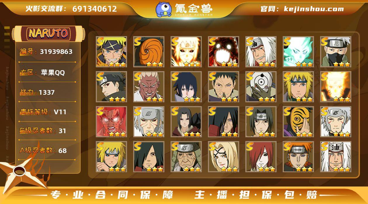 YY-31S/68A/V11/战力1336/忍者267/无二次/果Q43 【霸体10级 纲手52 日斩41 神驹斑60 十尾带土87 天道超51 仙人兜47 主场景-火影之梦 胜负已分-神驹佑将/水门 yy】 S:大蛇丸,水门,天道佩恩,十周年鸣佐,六尾鸣人,九喇嘛,永恒佐助,须佐卡卡西,自来也,豪杰自来也,传说自来也,百豪纲手,死门凯,秽土水门,金身水门,秽土日斩,秽土扉间,扉间,斑,秽土斑,须佐鼬,秽土鼬,须佐止水,神秘面具男,五影斑,白面具,忍战带土,四代艾,忍战艾,秽土长门,舍人 A:机械鸣人 面麻 仙鸣 金鸣 鹰佐 骨架 侠隐佐助 泉奈 百豪樱 忍战宁次 忍战小李 最终章雏田 幻卡 神卡 对决卡卡西 秽土阿斯玛 止水 新春水门 青水 新春我爱罗 忍战我爱罗 漂泊再不斩 秽土再不斩 再不斩 青年艾 忍战土台 蛇兜 不动 青年长门 漂泊佩恩 小南 新春小南 漂泊小南 神驹小南 黑绝 秽土角都 晓蛇 绯流琥蝎 夏日鼬 死迪 新春迪达拉 漂泊带土 加藤断 侠隐大野木 神农 普通人 雷影达鲁伊 桃博 仙人巳月 黑土 通灵:熊猫 万蛇 螃蟹 变色龙 蛞蝓 守鹤 梦貘 蛤蟆龙 鲨鱼 战力/组织以实际验号为准,如账号没有维护/赛季更新等不可抗拒因素发生变化,不属于账号质量问题