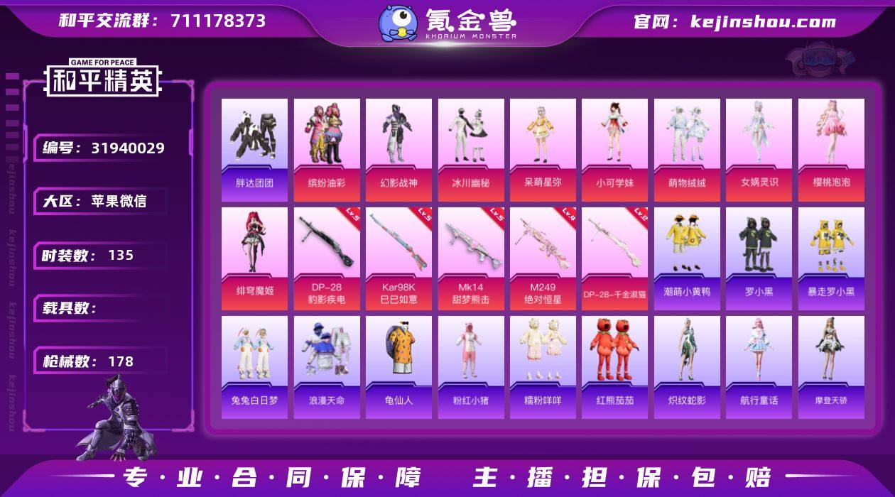 【战神公主号!双字id 战神框 猪妹 番茄 糯粉 兔兔 胖达 粉熊包】YXc25446-【无二次协助处理】【因赛季更新游戏段付以上号为准!】 苹果V-1稀有9粉装5特效枪13热门135套装178枪皮 8印记 历史无敌战神 【1稀有】 浪漫天命 【9粉装】 女娲灵识 绯穹魔姬 樱桃泡泡 呆萌星弥 小可学妹 幻影战神 缤纷油彩 萌物绒绒 冰川幽秘 【6特效枪】 Kar98K-巳巳如意 (5级) DP-28-千金淑猫 (2级) DP-28-豹影疾电 (5级) Mk14-甜梦熊击 (5级) M249-绝对恒星 (4级) Mk14-福马献瑞(5级) 【13热门】 龟仙人 红熊茄茄 青涩年华 潮萌小黄鸭 晶辉守护 糯粉咩咩 兔兔白日梦 暴走罗小黑 罗小黑 胖达团团 粉红小猪 狂沙舞者 破蛋小黄鸡 【1飞行器】 萌物绒绒飞行器 【1头盔】 幻影战神头盔 【2背包】 幻影战神背包 萌熊伴侣背包