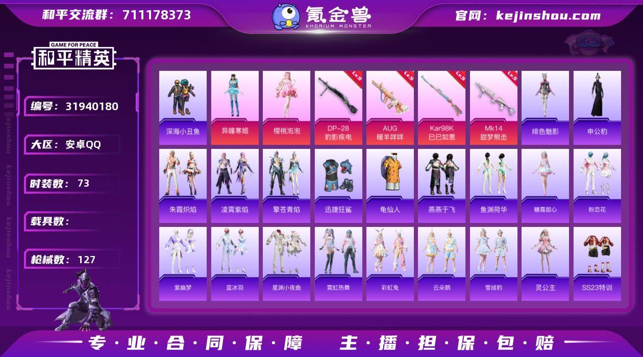 安卓 手Q-2粉装-6特效枪-0载具-1粉色飞行器-33238热力值-3王牌印记-73套装-127枪皮 【热门品类】:套装-深海小丑鱼,套装-龟仙人 【粉色套装】:角色-樱桃泡泡,角色-异瞳寒姬 【粉色枪皮等级】:AUG-暖羊咩咩(五级),Kar98K-巳巳如意(五级),Mk14-甜梦熊击(五级),Mk14-福马献瑞(五级),AA12-G-萌骑幻想(三级),DP-28-豹影疾电(五级) 【粉色枪皮】:AUG-暖羊咩咩,Kar98K-巳巳如意,Mk14-甜梦熊击,Mk14-福马献瑞,AA12-G-萌骑幻想,DP-28-豹影疾电 【粉色飞行器】:炫彩糖果飞行器 【粉色降落伞】:星之彼岸降落伞,镜光幻境降落伞,绝色倾城降落伞,江南烟雨降落伞,幻彩电音降落伞,炫彩糖果降落伞 【稀有套装】:套装-龟仙人,套装-雪国风尚,套装-炫彩糖果,套装-马上有钱,套装-燕燕于飞,套装-鱼渊荷华,角色-糖霜甜心,套装-粉恋花,套装-紫幽梦,套装-蓝冰羽,套装-星渊小夜曲,套装-霓虹热舞,套装-彩虹兔,套装-云朵鹅,套装-雪绒豹,角色-灵公主,套装-朱霞炽焰,套装-凌霄紫焰,套装-擎苍青焰,角色-申公豹,角色-绯色魅影 【稀有枪皮】:AKM-破晓战魂,AKM-龙的传人,M16A4-幻世战舞者,SCAR-L-夜灯,SCAR-L-炫彩节奏,SCAR-L-玉兔迎春,SCAR-L-红色方程式,M416-蓝色火焰,AUG-天降萌叽,AUG-耀粉歌者,QBZ-彩虹符号,M762-天降萌叽,M762-云朵鹅,G36C-星穹咏叹调,AC-VAL-天降萌叽,ARX-凌霄紫焰,UZI-啾咪啾咪,UZI-炫彩节奏,UZI-红色方程式,UZI-魔药课室,UMP45-夜灯,UMP45-生命誓言,UMP45-蓝色火焰,Vector-生命誓言,汤姆逊-耀粉歌者,JS9-凌霄紫焰,M24-樱桃泡泡,SKS-迅猛狂鲨,Mini14-炫彩节奏,Mini14-耀粉歌者,MK20-H-樱桃泡泡,SVD-云朵鹅,S686-红色方程式,S686-雪月幻音,S12K-玩趣呆呆,S12K-破晓战魂,S12K-夜灯,S12K-智耀战神,DBS-彩虹符号,SPAS-12-云朵鹅,M249-糯团...