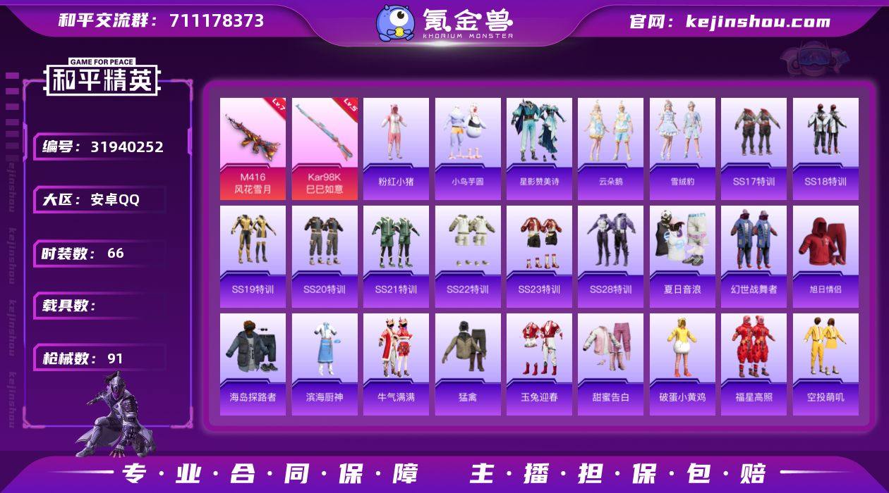无二次安卓 手Q-1粉装-3特效枪-0载具-1粉色飞行器-26010热力值-2王牌印记-66套装-91枪皮TD2603016 【热门品类】:套装-粉红小猪 【粉色套装】:角色-虎痴许褚 【粉色枪皮等级】:M416-风花雪月(七级),Kar98K-巳巳如意(五级),Mk14-福马献瑞(五级) 【粉色枪皮】:M416-风花雪月,Kar98K-巳巳如意,Mk14-福马献瑞 【粉色飞行器】:风花雪月飞行器 【粉色降落伞】:垂柳戏鸭降落伞,星穹咏叹调降落伞 【稀有套装】:套装-小鸟芋圆,套装-马上有钱,套装-星影赞美诗,套装-云朵鹅,套装-雪绒豹,角色-孙斩天 【稀有枪皮】:AKM-彩虹符号,AKM-破晓战魂,AKM-虎虎生威,SCAR-L-玉兔迎春,SCAR-L-碧影闪光,SCAR-L-冷漠罗丽,M416-糯团青竹,GROZA-异彩先驱,GROZA-蓝莓炮弹,AUG-天降萌叽,AUG-耀粉歌者,QBZ-飞驰魅影,M762-瑞龙福将,M762-诡娃娃,M762-云朵鹅,Mk47-洛神天依,AC-VAL-天降萌叽,蜜獾-娇憨猪猪,UZI-娇憨猪猪,UZI-影袭,UZI-炫彩节奏,UMP45-夜灯,汤姆逊-异彩先驱,MP5K-异彩先驱,P90-飞驰魅影,Kar98K-炫彩节奏,Kar98K-飞驰魅影,SKS-炫彩节奏,VSS-碧影闪光,Mini14-异彩先驱,Mini14-炫彩节奏,Win94-瑞龙福将,SLR-娇憨猪猪,SVD-云朵鹅,S686-生命誓言,S1897-飞驰魅影,S12K-玩趣呆呆,S12K-瑞龙福将,S12K-音爆索尼克,S12K-娇憨猪猪,S12K-幻世战舞者,SPAS-12-云朵鹅,DP-28-彩虹符号,MG3-幻世战舞者,MG3-瑞龙福将,沙漠之鹰-云朵鹅,大砍刀-云朵鹅 【其他套装】:套装-SS17特训,套装-SS18特训,套装-SS19特训,套装-SS20特训,套装-SS21特训,套装-SS22特训,套装-SS23特训,套装-SS28特训,套装-夏日音浪,套装-幻世战舞者,套装-旭日情侣,套装-海岛探路者,套装-滨海厨神,套装-牛气满满,套装-猛禽,套装-玉兔迎春,套装-甜蜜告白,套装-破蛋小黄鸡,套装-福星高照,套装-空投...