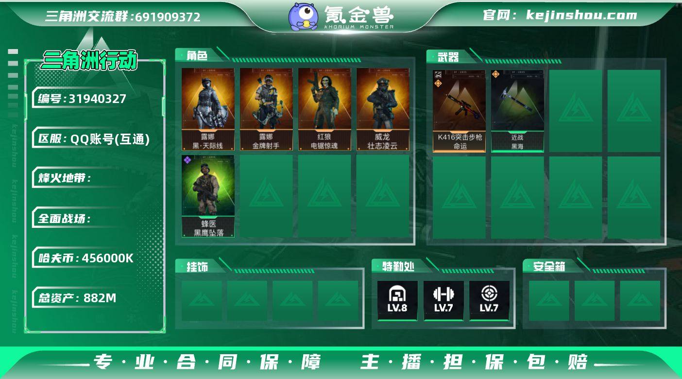 S1293总资产882M,哈夫币45600w,典藏1 近战2 枪皮数量314,露娜-黑天际线/露娜-金牌射手/红狼-电锯惊魂/深蓝-不破誓约/无名-夜鹰/威龙-壮志凌云/蜂医-送葬人无题密令,近战-黑海,K416突击步枪-命运(优品A)战场等级50上等兵, 行动等级60钻石,安全箱等时效性道具请以游戏内数据为准,详情请看图