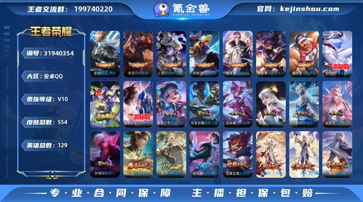 马年限定·花木兰异界灵契·满蛇年限定·最初的交响·瑶拾光映像·铠银白咏叹调·武则天·珍品无双馥梦繁花·暃朽木白哉·酷洛米之心·器灵落星盏·柯南·怪盗基德·可二次】w17422-安卓Q-129英雄-415皮肤-6王者印记-200铭文-贵族积分20w【贵族10】【4典藏·1珍品无双·5珍品·3星传说·78传说·30按键·94个性戳戳】【因赛季更新游戏段付以上号为准!】 【英雄全皮】:阿轲全皮,司马懿全皮,孙权全皮,敖隐全皮,蒙恬全皮,夏洛特全皮,空空儿全皮,影全皮 【荣耀典藏】:武则天英雄,铠银白咏叹调,瑶拾光映像,伽罗最初的交响 【珍品无双】:貂蝉馥梦繁花 【珍品传说】:暃朽木白哉,安琪拉酷洛米之心,嫦娥器灵落星盏,鲁班七号江户川柯南,马可波罗怪盗基德 【星元皮肤】:宫本武藏幽冥之眼,貂蝉金色仲夏夜,孙尚香未来机甲 【传说皮肤】:云缨神骥越千峰,关羽神骥镇沧海,朵莉亚神骥鸣幻洲,狄仁杰神骥赴朔漠,貂蝉神骥聚万邦,马超神骥逐星野,花木兰异界灵契,杨戬纵目迁山,后羿神树通天,干将莫邪千山共赴,大司命死亡执政官,司马懿九山相柳,司空震愿照山河定,女娲愿照千秋盛,妲己愿照众生和,澜愿照九州拓,蔡文姬愿照福禄聚,虞姬愿照岁时盈,云缨幻光神枪,嬴政玄雷天君,王昭君映山客,桑启鸣野蒿,庄周牧神诗旅,夏侯惇霜北刀,墨子黄金天蝎座,海月金乌负日,亚连落雪白狼,典韦战鼓燎原,孙尚香乘龙问璇玑,孙策乘龙淬吴钩,赵云乘龙铭钟鼎,马超琥珀纪元,艾琳觅芳踪,甄姬至美化雀舞,马可波罗妄想实况,东皇太一灼幽烈阳,诸葛亮鹤羽星尊,澜电玩雷克斯,亚瑟追逃游戏,安琪拉追逃游戏,张飞百相守梦,夏洛特浮生妄,干将莫邪画中仙,花木兰燃星之曲,虞姬无限倾心,项羽无限倾心,伽罗炽翼辉光,孙悟空齐天大圣,小乔山海琳琅生,曜山海苍雷引,李信山海炽霜斩,吕布怒海麟威,李白诗剑行,狄仁杰神器狴犴...