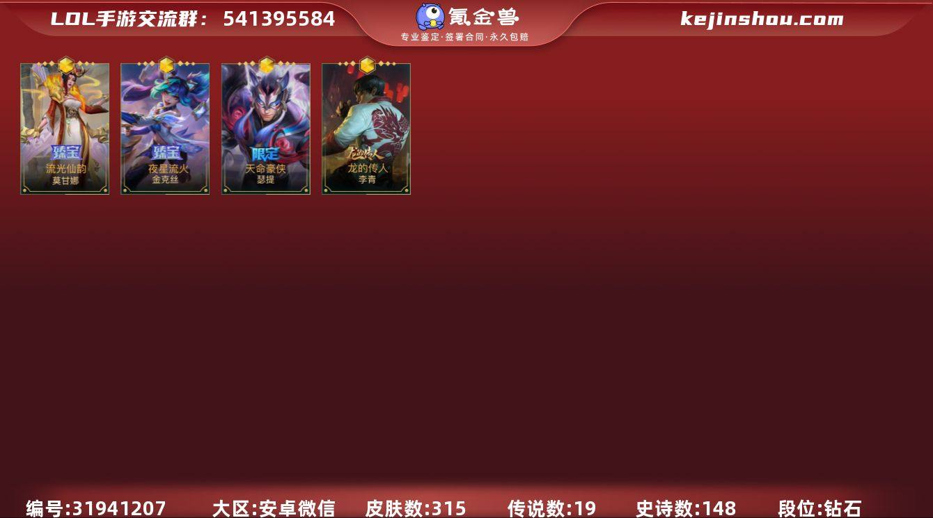 皮肤数:315 典藏皮肤数量:0 神话皮肤数量:4 传说皮肤数量:19 史诗皮肤数量:148 流光仙韵 莫甘娜,夜星流火 金克丝,天命豪侠 瑟提,龙的传人 段位:钻石 卖家说:充值2900多在里面 入手最划算 可小刀