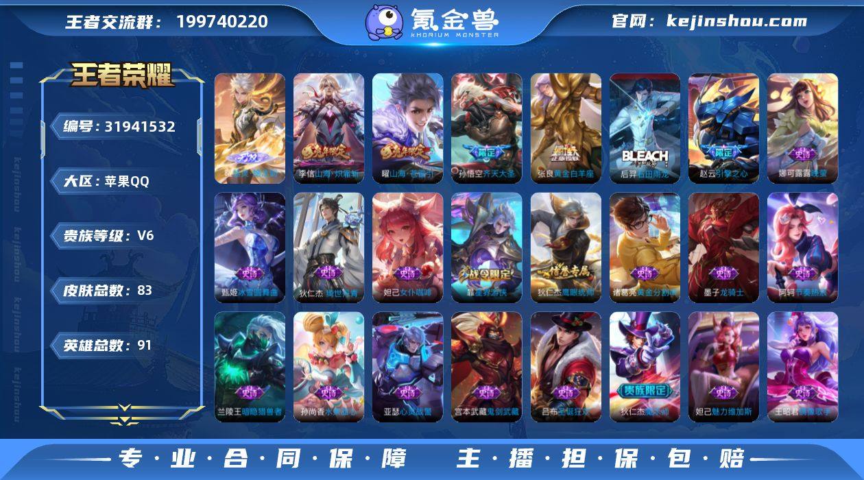 贵族7/皮肤233/典藏1/传说8/史诗70/英雄126/银白咏叹调/未来机甲/神树通天/云诺千山/愿照·九州拓/愿照·岁时盈/幻光神枪/鸣野蒿/浮生妄/末日机甲-孙尚香/天穹之誓(s36)/阴阳师/皇家上将/龙胆/狮舞东方/高山流水/玩趣恶龙/重明(s11)/赤莲之焰/云间偶戏/无心/朔风刀(s17)/游园惊梦/烛龙(s10)/穷奇(s12)/山海·玄木吟/魔术师/万华元夜(s22)/星际陆战队-达摩/沙漠行僧(s26)/海滩派对/醍醐杖(s20)/魔法小厨娘/演武夺筹(s23)/飞衡/驯魔猎人/金庭之子(s27)/潮玩骑士王/至尊宝/御旌(s15)/银河之约/云中旅人(s29)/神迹守卫-钟馗/驱傩正仪(s24)/遇见飞天/单词大作战/繁星吟游/华丽摇滚/原初探秘者(s21)/五谷丰年/青龙志/千军破阵(s25)/混沌棋(s18)/星空之诺/大漠名商(s28)/疑决卦(s19)/李小龙/擒涛扼浪(s31)/御狮(s13)/御霄(s14)/胡桃异想国/纤云弄巧/天狼溯光者/御銮(s16)/梁祝/天狼绘梦者/拒霜思/至美·乘鲤谣/狂想玩偶喵/探海日志(s32)/海盐诗旅(s30)/江河有灵/古海寻踪(s33)/蒙恬荣光圣徽/鬼谷子天穹祈灯(S34)/剑破天穹(s35)/熔金海岸/噬灭天穹(s37)/谧流熔炉/虚灵犬护/逆浪荇歌/星界战将/电玩小子/苍穹之光/紫霞仙子/未来纪元-赵云/圣诞恋歌/冰雪圆舞曲/偶像歌手/地狱岩魂/鬼剑武藏/水果甜心/暗夜贵公子/女仆咖啡/龙骑士/圣诞狂欢/绅士熊喵/幽灵船长/末日机甲-吕布/水晶猎龙者/德古拉伯爵/乘风破浪/暗隐猎兽者/黄金分割率/冰冠公主/特工魅影/曙光守护者/舞动绿茵/天才门将/功夫厨神/星夜王子/猫狗日记-孙策/箭羽风息/鹰眼统帅/修罗/遇见神鹿/时之恋人-孙尚香/月团寄思/万物之道/化蝶舞/龙之律动/涂山容容/教廷特使/街头霸王/致命风华/大发明家/忍·炎影/红桃皇后/星际陆战队(程咬金)/白色死神/东方不败/化身博士/救世之瞳/天使之翼/少女阿狸/黄金武士/拳王/兔女郎/五福同心/花好人间/万事如意/万象初新/阿尔法小队/纽约教...