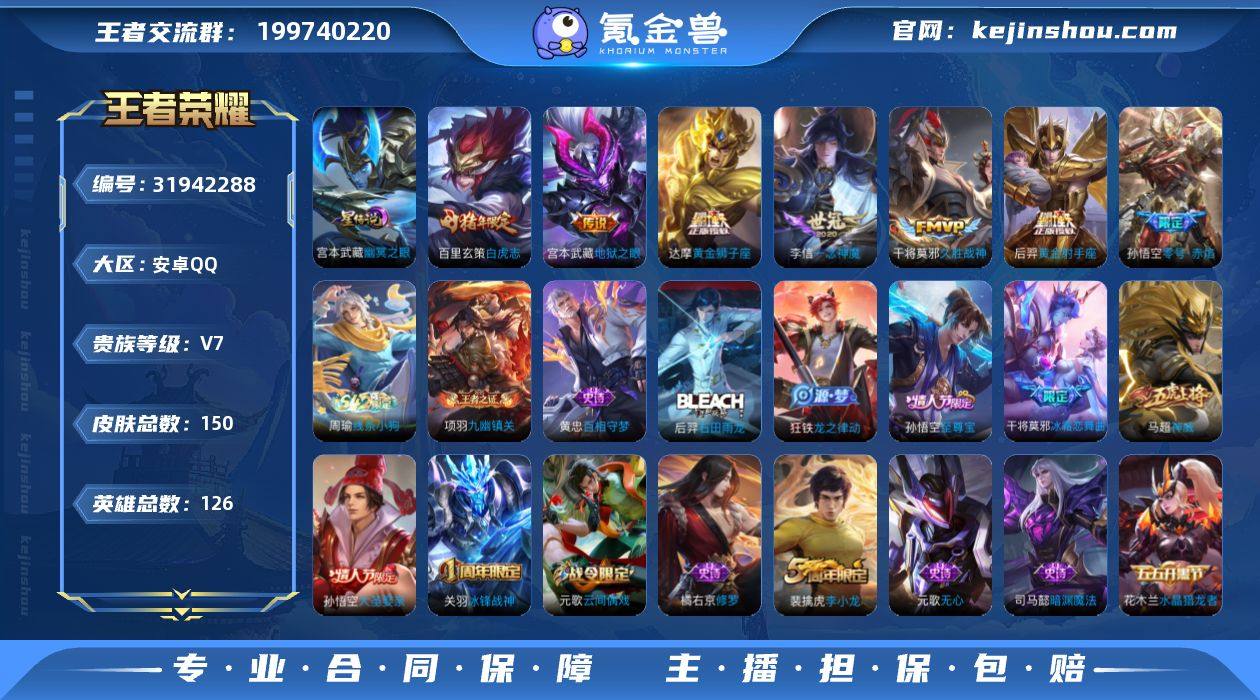 贵族等级:V7 典藏皮肤数:0 珍品无双皮肤数:0 无双皮肤数:0 珍品传说皮肤数:0 传说皮肤数:7 史诗皮肤数:47 皮肤数:150 英雄数:126 段位:荣耀王者 卖家说:现万战李信
