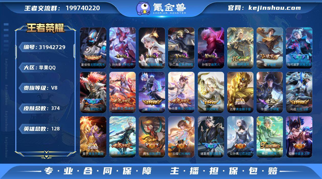 贵族等级: V8 英雄数: 127 皮肤数: 369 荣耀水晶: 无限飓风号 星传说: 未来机甲,幽冥火,金色仲夏夜,星际治安官 传说皮: 黄金狮子座,久胜战神,炽阳神光,一念神魔,地狱火,仲夏夜之梦,胖达荣荣,李逍遥,超时空战士-狄仁杰,无双飞将,记忆之芯,电玩·雷克斯,鹤羽星尊,灼幽烈阳,澜逐花归海,琥珀纪元铠,琥珀纪元马超,乘龙·问璇玑,乘龙·铭钟鼎,乘龙·淬吴钩,典韦战鼓燎原,黄金天蝎座,幻光神枪,神树通天 限定皮: 李小龙,岱宗,大圣娶亲,高山流水,孙行者,深海之息,枫霜尽,时之奇旅-妲己,五谷丰年,诗剑行,怒海麟威,鸣野蒿