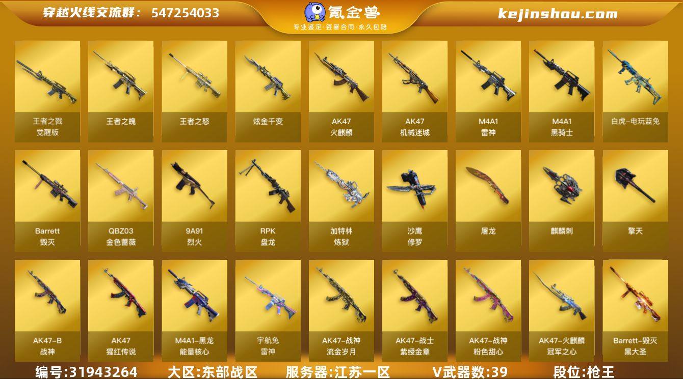 江苏一区-42V-3王者武器数-1炫金武器数 【热门武器】:QBZ03-金色蔷薇,白虎-电玩蓝兔,M4A1-黑骑士,RPK-盘龙*5,加特林-炼狱,沙鹰-修罗 【王者炫金武器】:王者之魄,王者之怒,炫金千变 【音效卡】:M4A1-黑骑士音效卡,Barrett-毁灭音效卡 【皮肤】:雷神-宇航兔皮肤,火麒麟-冠军之心,毁灭-星空,毁灭-黑大圣皮肤,毁灭-英雄计划 皮肤,黑龙-能量核心,战神-粉色甜心皮肤*6,战神-紫绶金章皮肤*14,战神-流金岁月皮肤*7 【角色】:樱,乔伊教练,初恋灵狐,芳心审判者,嘉年华灵狐,娟娟,零-水下丽影,龙儿-小淘气,麻雀,潘多拉-甜心教官,潜龙队-X,蜀雪,影武者-X 【人偶武器】:AWM-灵狐-15周年嘉年华,迷你深渊冰龙,迷你波特博士*2,夺魂*2,迷你牛牛,迷你火种,深渊终结者手雷,闪光弹-小乔,迷你超能女侍 【挑战大师】:AK47-冰龙粉碎者*2,神圣爆裂者-末日III*2 【英雄级武器】:AK47-火麒麟,M4A1-雷神,M4A1-黑骑士,AK47-机械迷城,QBZ03-金色蔷薇,9A91-烈火,王者之戮-觉醒版,AK-47-猩红传说*14,AK47-B-战神,白虎-电玩蓝兔,Barrett-毁灭,RPK-盘龙*5,加特林-炼狱,沙鹰-修罗,屠龙,擎天,麒麟刺 【道具】:冰冰企鹅背包,炫彩背包,背包-洛丽塔...