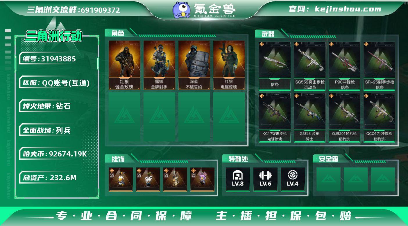 实名:不可二次实名 总资产:232.6M 哈夫币:92674.19K 烽火地带段位:钻石 烽火地带等级:60 全面战场段位:列兵 全面战场等级:14 8级仓库,6级训练中心,4级靶场,5级指挥中心,1级潜水中心,3级防具台,3级工作台,3级制药台,3级技术中心,0级收藏室 战术部门等级:3 战斗部门等级:2 医疗部门等级:2 研发部门等级:1 后勤部门等级:1 曼德尔砖-气象感应:0 曼德尔砖-命运王牌:0 曼德尔砖-电玩高手:0 曼德尔砖-美杜莎:0