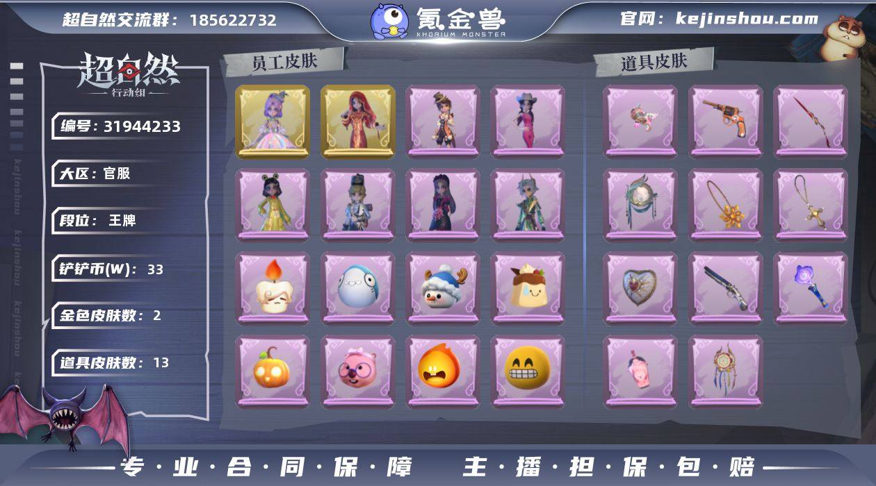 金色皮肤数量: 2 紫色皮肤数量: 6 道具皮肤数量: 13 段位: 王牌 员工: 逍遥,薇薇安,巫铃儿,莉莉,阿念,艾伦,小黄,零,爱丽丝,爱德华,兰,小满,临云 外观: 遗失的童话,镜花辞,王子与骑士,丝缕哀歌,泽引山海,嘻嘻头套,烈焰红唇头套,呆滞头套,炙热烧烤,卑微头套,哈士奇头套,滑稽头套,鱼头怪头套,面具马头套,萨卡班甲鱼头套,咬咬鲨头套,小狗蛇点点头套,毛球夹子,蝶恋花,未竟乐园,钗头凤,呱呱雨衣,九色祥鹿,火爆了头套,精致露比头套,惊魂南瓜,糖果守卫,兜风日程,樱桃奶油布丁,雪墩墩头套,太空鲨头套,耀眼的你,庆宴绮愿,烛光纪念,牛啤背包