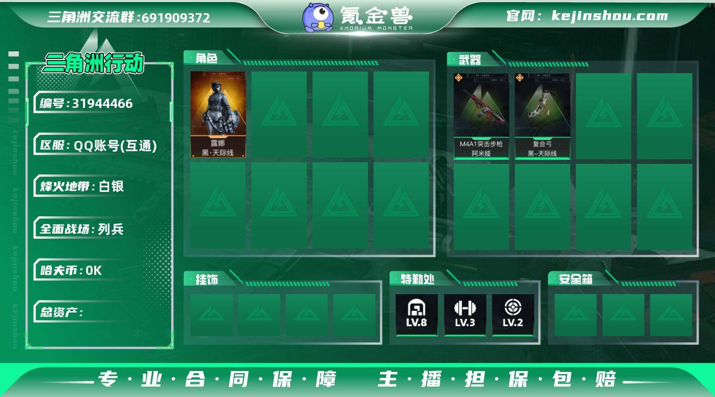 总资产:105.7M 2干员外观 2近战传说 17传说枪械 哈夫币:4.816K 不可修改实名 【烽火地带段位】白银 【全面战场段位】列兵 【干员外观】露娜-黑·天际线,无名-夜鹰(S4) 【传说武器皮肤】近战武器-处刑者,近战武器-暗星,SCAR-H战斗步枪-启航,KC17突击步枪-电锯惊魂,.357左轮-缄花,SR-25射手步枪-缄花,M14射手步枪-缄花,47突击步枪-暗星,SR-3M紧凑突击步枪-暗星,K416突击步枪-行动记录,腾龙突击步枪-马年祥瑞,G18-马年祥瑞,复合弓-黑-天际线,M4A1突击步枪-蚀金玫瑰,725双管霰弹枪-送葬人-无题密令,M4A1突击步枪-阿米娅,AK-12突击步枪-夜鹰