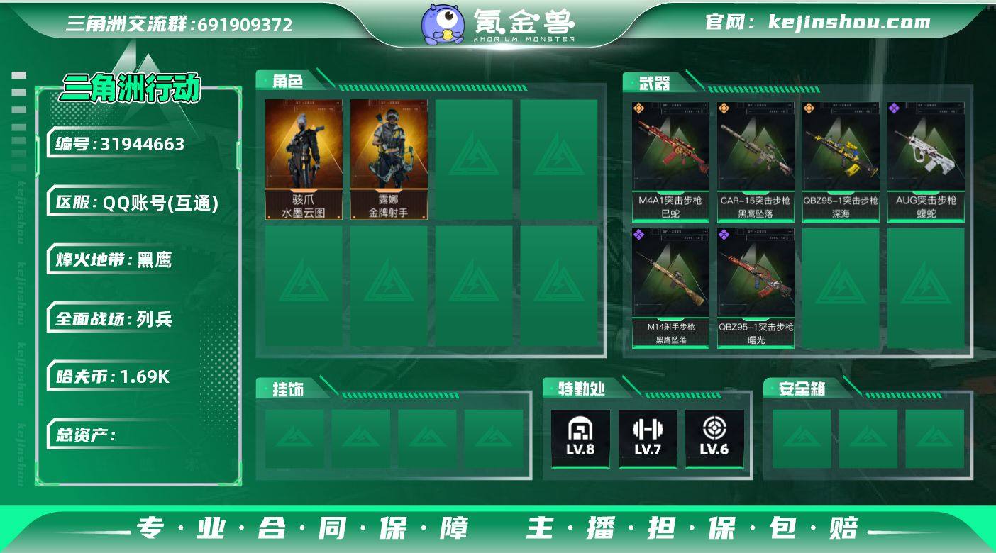 总资产202M【红皮骇爪 S7顶级安全箱 1颗AW子弹】哈夫币1,691K,行动等级:60,干员红皮数量:1,仓库等级:8级,训练中心等级:7级,靶场等级:6级,干员皮肤:2,枪皮:134 【近战武器】 黑鹰 【干员皮肤】 骇爪-水墨云图 露娜-金牌射手 【传说挂饰】 三足蟾 【其他典藏】 勇士冲锋枪-噬菌体 【枪皮】 M4A1突击步枪-高雅黑 QBZ95-1突击步枪-高雅黑 G3战斗步枪-高雅黑 QBZ95-1突击步枪-曙光 M4A1突击步枪-海色 QBZ95-1突击步枪-海色 AUG突击步枪-蝮蛇 SCAR-H战斗步枪-荣耀列队 PTR-32突击步枪-黄蜂 Scar-H突击步枪-水墨云图 QBZ191突击步枪-三角洲力量 SG552突击步枪-海浪 QBZ95-1突击步枪-海浪 CAR-15突击步枪-前沿科技 AK-12突击步枪-前沿科技 SCAR-H战斗步枪-数码迷彩 M4A1突击步枪-粉色涂装 M7战斗步枪-红色涂装 AUG突击步枪-浅蓝涂装 K416突击步枪-几何迷彩 K416突击步枪-高雅黑 SV-98狙击步枪-红色涂装 Mini-14射手步枪-荣耀列队 SR-25射手步枪-黄蜂 SMG-45-行动开启 MP5冲锋枪-海色 SMG-45冲锋枪-幻影结构 UZI冲锋枪-海色 MP5冲锋枪-黄蜂 QCQ171冲锋枪-三角洲力量 Vector冲锋枪-先锋 MP5冲锋枪-前沿科技 Vector冲锋枪-几何迷彩 MP5冲锋枪-弄臣 M1014霰弹枪-海浪 M1014霰弹枪-高雅黑 M1014霰弹枪-幻影结构 QJB201轻机枪-三角洲力量 M249轻机枪-毛鲁斯之力 M249轻机枪-黄蜂 G18-星链科技 G18-前沿科技