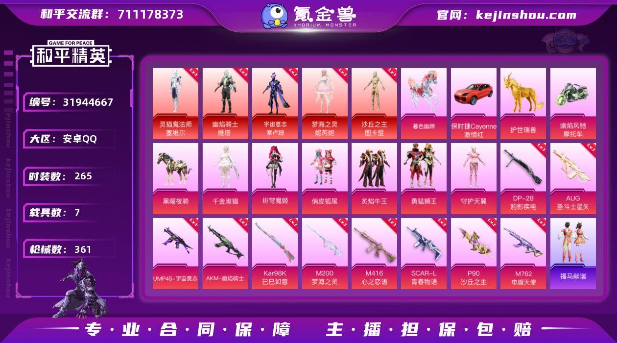 【5红装5级图卡盟7载具11特效枪7粉装素材号 秒换绑不用等】 安卓Q区-136557热力值-20印记-265套装-361枪皮 【5红装】 沙丘之主-图卡盟(5级) 灵猫魔法师-塞维尔(1级) 梦海之灵-妮芮妲(1级) 宇宙意志-塞卢姆(1级) 幽焰骑士-维塔(1级)【7载具】 护世瑞兽 兰博轿车灰色 兰博SVJ绿色 暮色幽蹄 保时捷Cayenne(激情红) 幽焰风驰摩托车 黑曜夜骑【7粉装】 圣堂之誓 勇猛狮王 炙焰牛王 俏皮狐尾 角色-绯穹魔姬 角色-守护天翼 角色-千金淑猫【11特效枪】 M200-梦海之灵(3级) UMP45-宇宙意志(3级) AKM-幽焰骑士(3级) P90-沙丘之主(3级) M416-心之恋语(7级) Mk14-福马献瑞(5级) SCAR-L-青春物语(7级) M762-电糖天使(6级) AUG-圣斗士星矢(3级) Kar98K-巳巳如意(5级) DP-28-豹影疾电(5级)【328热门】 仓鼠灰灰 雪山精英(老6服) 梦魇先生 破蛋小黄鸡 军刀雅典娜 极速红龙 赛罗奥特曼 醒狮腾龙 团圆交子 瑞龙福将 M416-仓鼠灰灰 冰公主 冰川格斗者 白色伏地魔 SS9特训 SS8特训 SS6特训 SS4特训 SS27特训 SS26特训 SS25特训 SS24特训 SS23特训 SS22特训 SS10特训 S12K-华贵君王 Mk47-洛神天依 M762-乌木金纹 AWM-雷霆特警 AWM-不夜海上花 M416-乌木金纹 GROZA-乌木金纹 SCAR-L-玉兔迎春 GROZA-田园牧歌 GROZA-恐龙拽拽 Mk47-乌木金纹 UZI-娇憨猪猪 M416-夜灯 S12K-垂柳戏鸭 DBS-彩虹符号 M249-彩虹符号 MG3-幻世战舞者 AKM-虎虎生威 AKM-霓虹街区 万圣娃娃 M416-蓝色火焰 GROZA-异彩先驱 GROZA-彩虹符号 M762-镭射皇者 众神之王 长空猛禽 异彩先驱 虚音幻奏 甜心亚梦 甜蜜熊情侣 特训学院 拳皇97八神庵 青涩时光 青年教官 牛气冲天 霓虹街区 霓虹极客 魅力单车 六六大吉 凛冬战士