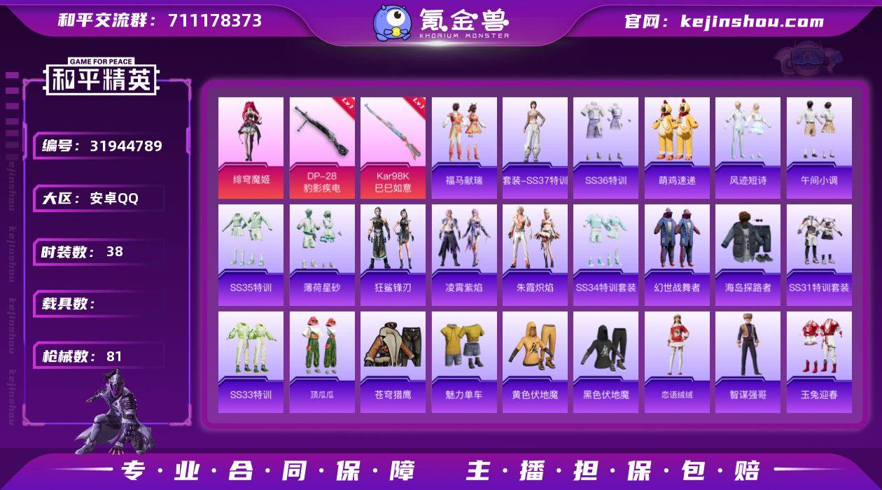 【4特效枪1粉装 秒换绑不用等】 安卓Q区-18110热力值--38套装-81枪皮 【1粉装】 角色-绯穹魔姬【4特效枪】 Mk14-福马献瑞(3级) ACE32-萌骑漫游(2级) Kar98K-巳巳如意(5级) DP-28-豹影疾电(5级)【83热门】 SCAR-L-玉兔迎春 UMP45-蓝色火焰 DBS-彩虹符号 MG3-幻世战舞者 M416-蓝色火焰 魅力单车 猎鹰 黄色伏地魔 黑色伏地魔 海岛探路者 S1897-糯团青竹 M24-樱桃泡泡 GROZA-紫矿核心 顶瓜瓜 MG-36-薄荷星砂 GROZA-福马献瑞 恋语绒绒 SS34特训 朱霞炽焰 AWM-天降萌叽 大橘大利 凌霄紫焰 蓝冰羽 PKM-啾咪啾咪 SS31特训 SS33特训 SS32特训 巳巳如意 紫幽梦 MG3-霓彩脉冲 狂鲨锋刃 SS36特训 老实芭蕉 智谋强哥 粉恋花 战术大师 JS9-凌霄紫焰 MG-36-凌霄紫焰 蜜獾-启元战纹 马上有钱 ARX-凌霄紫焰 P92-凌霄紫焰 平底锅-凌霄紫焰 突击盾牌-虎痴许褚 蜜獾-虎痴许褚 狙击之神 破片手榴弹-海盐豹豹 UMP45-海盐豹豹 M417-玩趣呆呆 Mk14-薄荷星砂 AUG-紫晶流影 燃烧瓶-福马献瑞 PKM-紫幽梦 破片手榴弹-巳巳如意 Mk14-紫幽梦 SCAR-L-星途旅人 SS35特训 S1897-紫幽梦 P92-紫幽梦 平底锅-紫幽梦 S12K-霓彩脉冲 AKM-霓彩脉冲 AUG-异域银装 DBS-风迹短诗 十字弩-异域银装 莫辛纳甘-风迹短诗 MK12-风迹短诗 Mk47-风迹短诗 蜜獾-风迹短诗 破片手榴弹-拽到爆炸 信号枪-异瞳寒姬 SVD-霓彩脉冲 铝热弹-炫彩糖果 UZI-炫彩糖果 Mini14-鸡智如我 P90-巳巳如意 S686-巳巳如意 午间小调 萌鸡速递 风迹短诗 SS37特训 炫彩糖果 破片手榴弹-呆爆全场【2飞行器】 光之冒险尾迹 炫彩糖果飞行器【10背包】 守护天翼背包(3级) 第五大道背包(3级) 鬼刀背包(3级) 智谋强哥背包(3级) 巳巳如意背包(3级) 紫幽梦背包(3级) 幻彩电音背包(3级) 萌鸡速递背包(3级) 炫彩糖果背包(3级) 狂鲨锋刃背包(3级) 营地ID:989790348