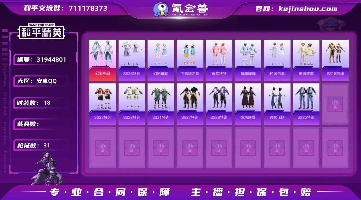 安卓 手Q-3粉装-6特效枪-0载具-0粉色飞行器-46208热力值-10王牌印记-95套装-159枪皮 【热门品类】:套装-龟仙人 【粉色套装】:粉装-闲梦青缨,粉装-蜜语绒猫,角色-绯穹魔姬 【粉色枪皮等级】:SCAR-L-锦绣绵绵(五级),Kar98K-未来歌姬(五级),Kar98K-巳巳如意(五级),AMR-智耀战神(七级),DP-28-豹影疾电(五级),MG3-酷泡奶龙(六级) 【粉色枪皮】:SCAR-L-锦绣绵绵,Kar98K-未来歌姬,Kar98K-巳巳如意,AMR-智耀战神,DP-28-豹影疾电,MG3-酷泡奶龙 【粉色降落伞】:香水柠檬降落伞,蓝莓炮弹降落伞,旋转彩虹降落伞,莲影清波降落伞,镜光幻境降落伞,精灵梦叶罗丽降落伞,千金淑猫降落伞,雪月幻音降落伞,智耀战神降落伞,幻彩电音降落伞,荧海星豚降落伞 【稀有套装】:套装-龟仙人,套装-绒宝小鹅,套装-巳巳如意,套装-雏菊兔兔,套装-萝兰蝴蝶,套装-糖糖葫芦,套装-青团波波,角色-都市丽猫,角色-摩登魅猫,套装-燕燕于飞,套装-鱼渊荷华,套装-粉恋花,套装-紫幽梦,套装-蓝冰羽,角色-瑰梦爱神,套装-霓虹热舞,套装-彩虹兔,套装-云朵鹅,套装-雪绒豹,套装-蜜露汐语 【稀有枪皮】:AKM-彩虹符号,AKM-破晓战魂,AKM-霓虹街区,AKM-龙的传人,M16A4-莲影清波,M16A4-千金淑猫,SCAR-L-小狗蛇点点,M416-暗夜行者,M416-糯团青竹,M416-绯红前夜,M416-蓝色火焰,GROZA-懵萌河马,GROZA-田园牧歌,GROZA-荧海星豚,AUG-天降萌叽,AUG-耀粉歌者,M762-天降萌叽,M762-第五大道,M762-云朵鹅,Mk47-妙红点点,Mk47-炫光之旅,G36C-懵萌河马,AC-VAL-天降萌叽,AC-VAL-快闪甜心,AC-VAL-闲梦青缨,蜜獾-天降萌叽,UZI-啾咪啾咪,UZI-天降萌叽,UMP45-夜灯,UMP45-生命誓言,UMP45-绒宝小鹅,Vector-田园牧歌,汤姆逊-天降萌叽,汤姆逊-耀粉歌者,P90-快闪甜心,P90-飞驰魅影,P90-巳巳如意,Kar98K-红色...