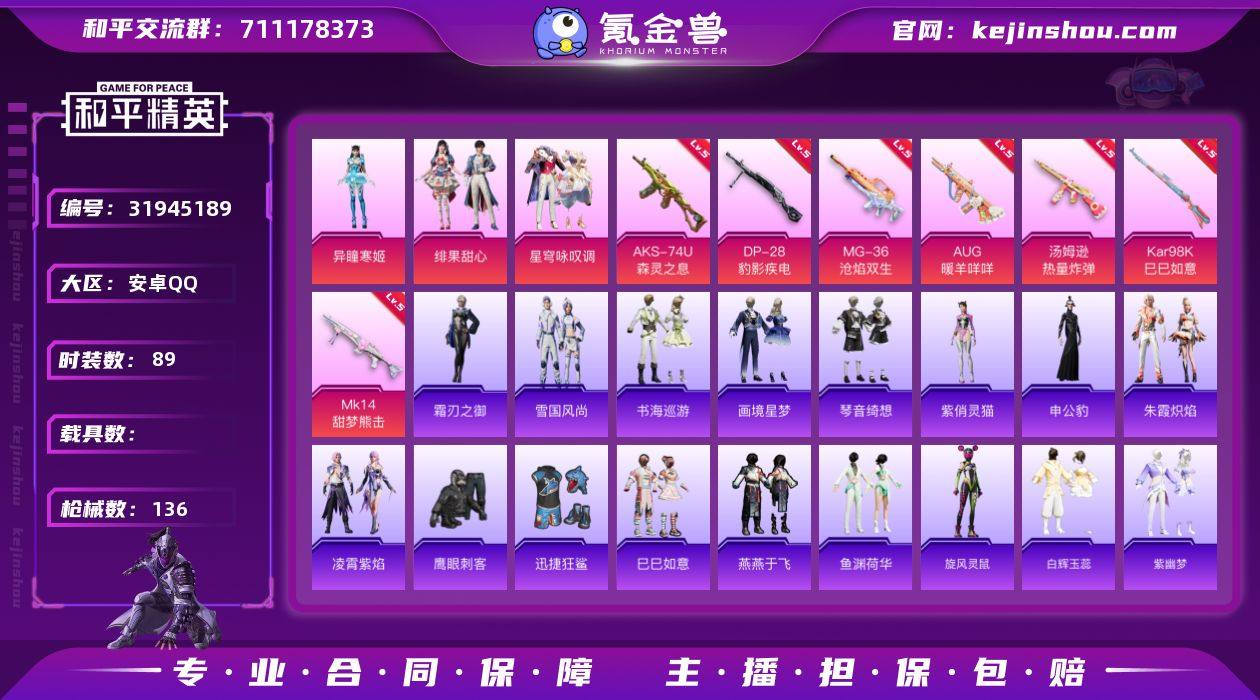 安卓 手Q-3粉装-7特效枪-0载具-1粉色飞行器-34988热力值-6王牌印记-89套装-136枪皮 【粉色套装】:粉装-绯果甜心,粉装-星穹咏叹调,角色-异瞳寒姬 【粉色枪皮等级】:AUG-暖羊咩咩(五级),汤姆逊-热量炸弹(五级),AKS-74U-森灵之息(五级),Kar98K-巳巳如意(五级),Mk14-甜梦熊击(五级),DP-28-豹影疾电(五级),MG-36-沧焰双生(五级) 【粉色枪皮】:AUG-暖羊咩咩,汤姆逊-热量炸弹,AKS-74U-森灵之息,Kar98K-巳巳如意,Mk14-甜梦熊击,DP-28-豹影疾电,MG-36-沧焰双生 【粉色降落伞】:千金淑猫降落伞,桃粉嫣然降落伞,戏水时光降落伞,雪月幻音降落伞,智耀战神降落伞,星穹咏叹调降落伞,幻彩电音降落伞,喜羊羊与灰太狼降落伞,异瞳寒姬降落伞,极意拳锋降落伞,炫彩糖果降落伞,罪夜之冕降落伞 【稀有套装】:套装-巳巳如意,套装-雪国风尚,套装-炫彩糖果,套装-燕燕于飞,套装-鱼渊荷华,套装-旋风灵鼠,套装-白辉玉蕊,套装-紫幽梦,套装-蓝冰羽,套装-星渊小夜曲,套装-霓虹热舞,套装-云朵鹅,套装-雪绒豹,套装-诡诞巡游,套装-混沌火种,角色-绛羽幽主,套装-朱霞炽焰,套装-凌霄紫焰,角色-申公豹,角色-紫俏灵猫,套装-书海巡游,套装-画境星梦,套装-琴音绮想...