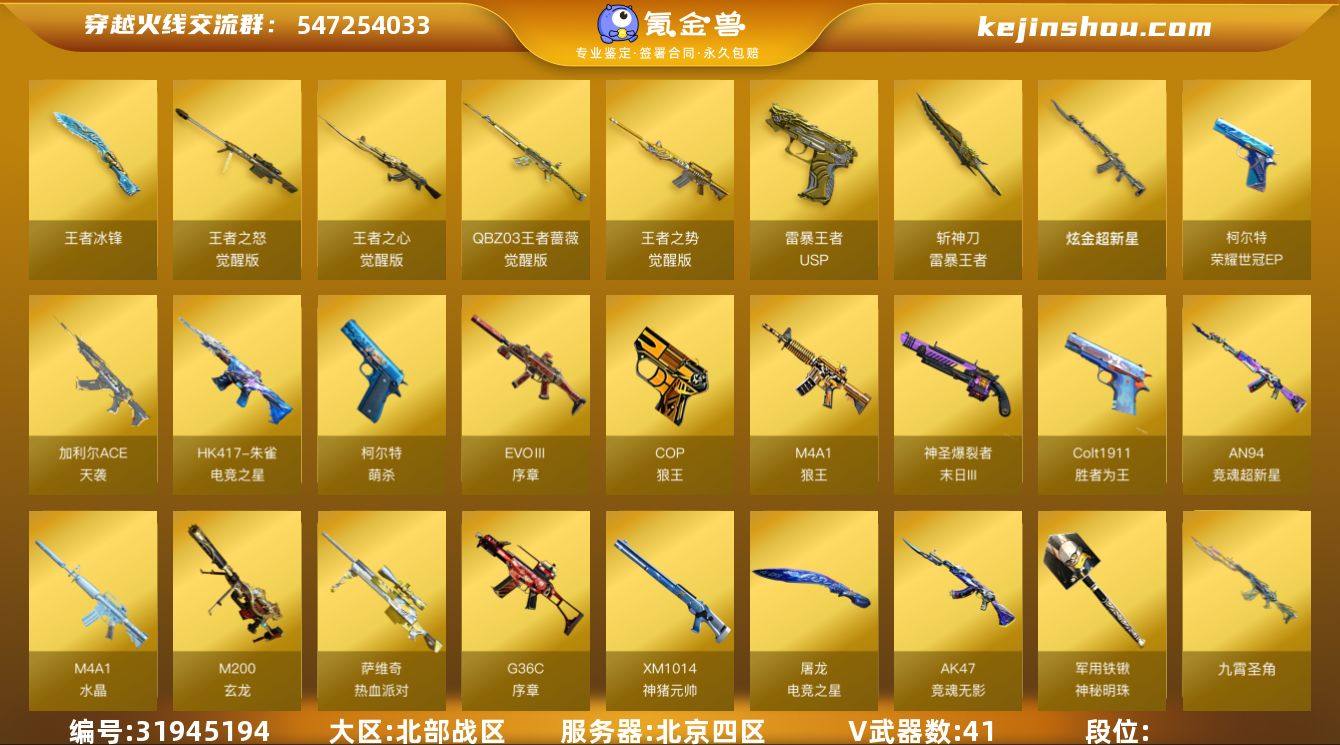 VIP等级:VIP6 V武器数:41 王者武器数:8 炫金武器数:1 炽渊之怒 觉醒版,王者冰锋,王者之怒-觉醒版,王者之心-觉醒版,QBZ-03-王者蔷薇-觉醒版,王者之势-觉醒版,USP雷暴王者,斩神刀-雷暴王者 炫金超新星 AK47-竞魂无影,AN94-竞魂超新星,Colt1911-胜者为王,COP-狼王,EVOⅢ-序章,G36C-序章,HK417-朱雀-电竞之星,加利尔ACE-天袭,军用铁锹-神秘明珠,柯尔特-萌杀,柯尔特-荣耀世冠EP,M200-玄龙,M4A1-狼王,M4A1-水晶,M4A1-再燃火线,神圣爆裂者-末日III,萨维奇-热血派对,屠龙-电竞之星,XM1014-神猪元帅,九霄圣角,FAMAS G2-天戎,无影-神兵利器,超新星-热带奇洋,龙啸-热带奇洋,USP-小动物,COP-堕天神,云龙扇,VSK-94-金蚀,AK47-火麒麟,M4A1-雷神,黑骑士-海王,M4A1-黑骑士,M4A1-黑龙,M200-幻神,Barrett-毁灭,AWM-天龙,Kar98k-星神,AA-12-雷霆,QBZ03-金色蔷薇,Scar Light-白虎,屠龙,擎天,炽芒蝶刃,M200-竞技荣光,柯尔特-竞技荣光,擎天-竞技荣光,AK-47-猩红传说,裁决,天神,唐刀神工天巧,M4A1-苍鸣雷神,Barrett-碧霄极光 传说艾莉莎,传说星骇 王者-零-传说之路,王者玲珑 团团,妮妮,机械姬,零,零·纪元,审判者,鹰 HK417-朱雀-电竞之星-竞星跃动音效卡,九霄圣角音效卡,屠龙-电竞之星-竞星跃动音效卡,天罚音效卡,云海游龙音效卡,AWM-裁决音效卡,M4A1-黑骑士音效卡,Barrett-毁灭音效卡,M4A1-雷神音效卡