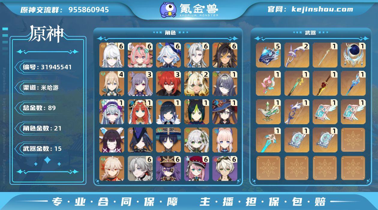 冒险等级:60 总黄数:89 5星角色数:21 5星武器数:15 原石数量:1728 纠缠之源数量:5 6命兹白,6命瓦雷莎,6命芙宁娜,6命那维莱特,6命迪希雅,4命琴,3命刻晴,3命迪卢克,2命希诺宁,1命菈乌玛,1命梦见月瑞希,1命妮露,1命夜兰,1命提纳里,1命莫娜,0命哥伦比娅,0命克洛琳德,0命流浪者,0命纳西妲,0命珊瑚宫心海,0命枫原万叶 6命叶洛亚,6命爱诺,6命班尼特,6命嘉明,6命香菱,6命行秋,6命夏洛蒂,6命夏沃蕾,6命伊安珊,6命芭芭拉,6命北斗,6命重云,6命迪奥娜,6命多莉,6命珐露珊,6命菲谢尔,6命卡维,6命柯莱,6命米卡,6命诺艾尔,6命砂糖,6命五郎,6命辛焱,6命烟绯,6命瑶瑶,4命赛索斯,4命伊法,4命莱依拉,4命鹿野院平藏,4命托马,3命久岐忍,3命卡齐娜,3命蓝砚,3命坎蒂丝,3命云堇,2命菲米尼,2命塔利雅,2命雷泽,2命凝光,2命早柚,1命琳妮特,1命欧洛伦,1命绮良良,1命安柏,1命九条裟罗,1命凯亚,1命丽莎,0命罗莎莉亚 精5万世流涌大典,精2阿莫斯之弓,精1朏魄含光,精1纺夜天镜,精1溢彩心念,精1岩峰巡歌,精1有乐御簾切,精1静水流涌之辉,精1千夜浮梦,精1若水,精1天空之卷,精1天空之刃,精1四风原典 100%侦察骑士,古恩希尔德的传承,帆影游风,海风之梦,霓裾翩跹,倩影游侠,莎邦之息,岁夜欢哗,星与月之约,雨化竹身,致教会自由人 卖家说:看清楚!!!是三大战舰完整队伍,不要拿那种抢队友缺队友的垃圾队伍来对比!!(氪金号,号上还有30抽+150天月卡。新出6+5龙王战舰,61兹白,95级61牛牛,充值记录可查,刚充值一万多的账号,卖了回点血。)可屯资源到莉奈娅复刻直接组成月结晶战舰!