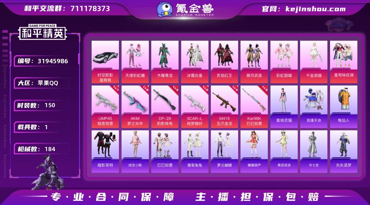 苹果 手Q-8粉装-6特效枪-1载具-4粉色飞行器-60357热力值-10王牌印记-150套装-184枪皮 【热门品类】:套装-浪漫天命,套装-龟仙人,套装-暗影哥特 【粉色载具】:时空跃影(星辉银) 【粉色套装】:粉装-天使彩虹糖,粉装-木曜青龙,粉装-冰霜白皇,粉装-炙焰红王,粉装-朗月武圣,粉装-彩虹甜喵,角色-千金淑猫,粉装-星穹咏叹调 【粉色枪皮等级】:AKM-梦之光华(六级),SCAR-L-纯梦嫁纱(五级),M416-五爪金龙(五级),UMP45-相思残雪(七级),Kar98K-巳巳如意(五级),DP-28-豹影疾电(五级) 【粉色枪皮】:AKM-梦之光华,SCAR-L-纯梦嫁纱,M416-五爪金龙,UMP45-相思残雪,Kar98K-巳巳如意,DP-28-豹影疾电 【粉色飞行器】:魔法神域飞行器,幽焰列车飞行器,极意拳锋飞行器 【粉色降落伞】:绝对恒星降落伞,童趣迷兔降落伞,王牌四分卫降落伞,暗夜玫瑰降落伞,甜心娃娃降落伞,彩虹甜喵降落伞,第五大道降落伞 【稀有套装】:套装-龟仙人,套装-绒宝小鹅,套装-巳巳如意,套装-雏菊兔兔,套装-萝兰蝴蝶,套装-糖糖葫芦,套装-青团波波,角色-许七安,角色-光矢逐梦,套装-燕燕于飞,套装-鱼渊荷华,角色-海琴烟,角色-紫俏灵猫,套装-炫彩糖果 【稀有枪皮】:AUG-冰晶雪宝,AKM-冰凉西瓜,AKM-夜灯,AKM-彩虹符号,AKM-生命誓言,AKM-破晓战魂,AKM-萌趣颜团子,AKM-虎虎生威,AKM-霓虹街区,AKM-龙的传人,M16A4-幻世战舞者,M16A4-蓝色火焰,SCAR-L-炫彩节奏,SCAR-L-玉兔迎春,SCAR-L-红色方程式,SCAR-L-净心行者,M416-夜灯,M416-糯团青竹,M416-红色方程式,M416-蓝色火焰,GROZA-异彩先驱,GROZA-彩虹符号,GROZA-懵萌河马,GROZA-甜蜜草莓,AUG-耀粉歌者,AUG-青春冒险家,QBZ-彩虹符号,M762-天降萌叽,M762-彩虹符号,M762-瑞龙福将,M762-甜心宝贝,M762-第五大道,M762-绯红前夜,Mk47-妙红点点,Mk...