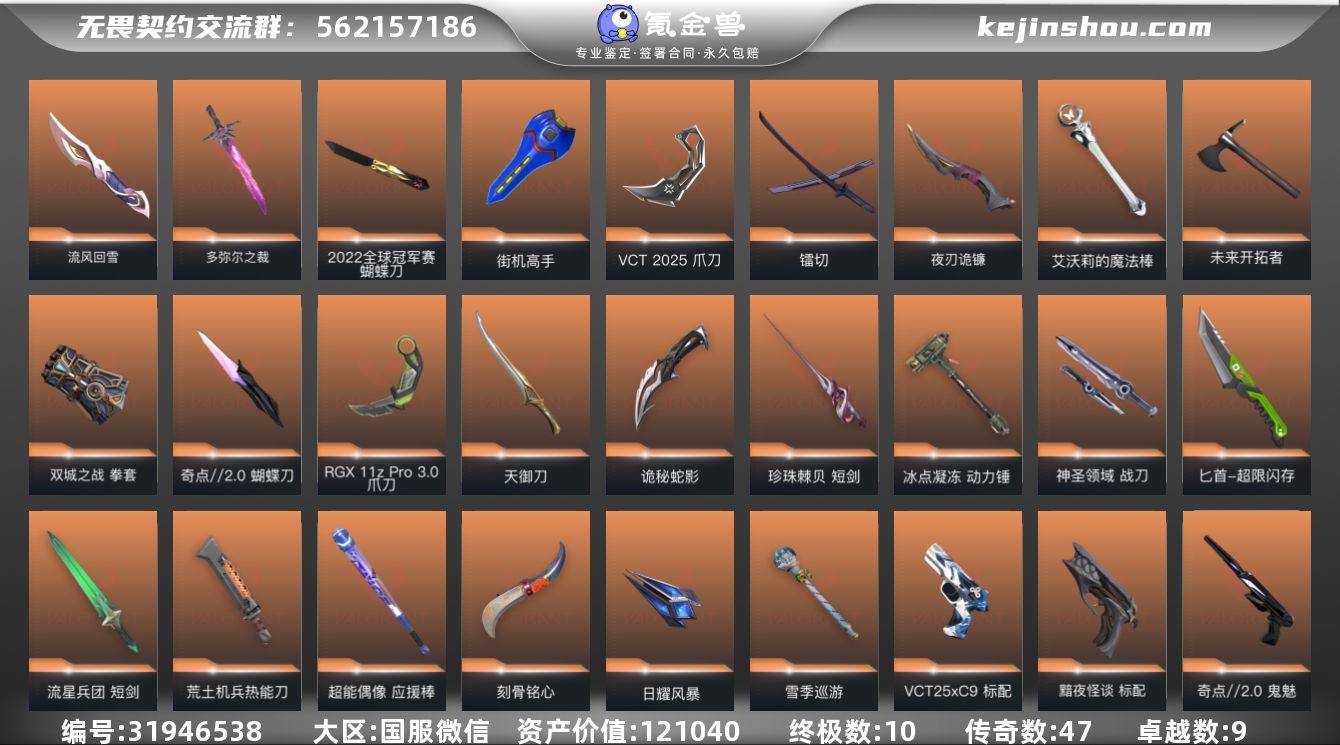 段位: 黄金 亮点皮肤: 幻影-2022全球冠军赛,蝴蝶刀-2022全球冠军赛 套装: 艾沃莉的梦之翼套装,RGX 11z Pro//3.0套装,源能者娱乐系统套装,黯夜怪谈套装,奇点//2.0套装,《双城之战》收藏套装,VCTCN2025套装,西部未来,VCT 2025赛季礼包,2022全球冠军赛 近战武器皮肤: 动力锤-冰点凝冻,雪季巡游-浪漫雪国,短剑-珍珠棘贝,天御刀-天界神兵//2.0,军刀-流星军团错误,街机高手-源能者娱乐系统,艾沃莉的魔法棒,超能偶像 应援棒,爪刀-RGX 11z Pro 3.0,短剑-流星兵团,夜刃诡镰-黯夜怪谈,匕首-超限闪存,蝴蝶刀-奇点//2.0,刻骨铭心-永远铭记,拳套-双城之战,荒土机兵热能刀,镭切-创·纪元,神圣领域 战刀,未来开拓者-西部未来,VCT 2025 爪刀,诡秘蛇影,日耀风暴,多弥尔之裁,流风回雪-千灵华绽//2.0 步枪皮肤: 狂徒-紫阙金琅,狂徒-盖亚的复仇,狂徒-冰点凝冻,幻影-洪荒怒焰,幻影-天界神兵2.0,戍卫-般若假面,狂徒-海洋之星,獠犬-源能者娱乐系统,幻影-源能者娱乐系统,狂徒-艾沃莉的梦之翼,狂徒-混沌序曲,獠犬-黯夜怪谈,幻影-黯夜怪谈,狂徒-奇点//2.0,幻影-涂鸦伙伴,狂徒-双城之战,狂徒-上古龙炎,狂徒-创·纪元,幻影-西部未来,幻影-电音光谱,狂徒-光荣异象,多弥尔的复仇 狂徒 佩枪皮肤: 标配-冰点凝冻,鬼魅-盖世英雄,鬼魅-源能者娱乐系统,鬼魅-艾沃莉的梦之翼,正义-RGX 11z Pro 3.0,标配-黯夜怪谈,鬼魅-奇点//2.0,标配-VCT25xC9,正义-西部未来,蒙太奇 狂怒 狙击枪皮肤: 冥驹-源能者娱乐系统,莽侠-RGX 11z Pro 3.0,飞将-黯夜怪谈,飞将-西部未来 冲锋枪皮肤: 骇灵-奇点,骇灵-艾沃莉的梦之翼 霰弹枪皮肤: 判官-上古龙炎 机枪皮肤: 奥丁-全息波普,奥丁-艾沃莉的梦之翼,奥丁-西部未来 亮点: 【优质装备】:艾沃莉的梦之翼套装,源能者娱乐系统套装,黯夜怪谈套装,RGX 11z Pro//3.0套装,奇点//2.0套装,《双城之战》收藏套装,幻影-源能者娱乐系统,冥...