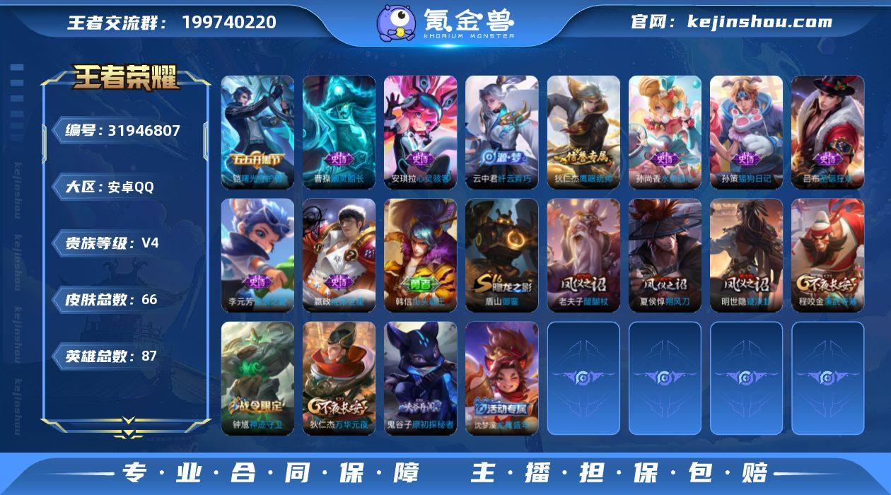 JJ3886:安卓Q-V4-最强王者-87英雄-66皮肤-1典藏-1传说【九霄神辉 神树通天 2太阳】-12史诗 【稀有英雄】 不知火舞 橘右京 娜可露露 韩信 艾琳 赵云 【典藏皮肤】 九霄神辉 【传说皮肤】 神树通天 【限定皮肤】 九霄神辉 【史诗皮肤】 狮舞东方 摇滚巨星 鹰眼统帅 纤云弄巧 猫狗日记 逐浪之夏 梁祝 圣诞狂欢 曙光守护者 心灵骇客 水果甜心 幽灵船长 【勇者皮肤】 圆桌骑士 拳王 龙舞盛年 丁香结 朔风刀 醍醐杖 归虚梦演 黄金武士 阴阳师 海滩派对 万华元夜 演武夺筹 红桃皇后 原初探秘者 疑决卦 化身博士 幻乐之宴 兔女郎 未来纪元 花好人间 御銮 教廷特使 街头霸王 少女阿狸 神迹守卫 【其他皮肤】 花见巫女 熊喵少女 海之征途 木偶奇遇记 福禄兄弟 帝国元帅 绯红之刃 星航指挥官 启蛰 隐刃 异域舞娘 占星师 激情绿茵 归虚梦演 西部大镖客 荷鲁斯之眼 特种部队 美梦成真