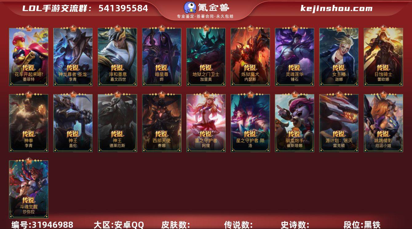 [17249382]2神话 1限定 21传说 57史诗 128皮肤 可二次 可修改实名 【段位】翡翠 【神话皮】桃映暖春 灼灼芳菲 拉克丝,黎明使者 破晓之殇 佛耶戈 【限定皮肤】山海绘卷泰坦 【传说皮】暗星尊,御风墨影 亚索,驯龙学者 黑默丁格,花车开起来咯 墨菲特,神龙尊者 圣龙 李青,淳和墨意 嘉文四世,斗魂觉醒 莎弥拉,地狱之门卫士,西部天使赛娜,神王诺手,神王盖伦,神拳盲僧,日蚀骑士蕾欧娜,女主播风女,炼狱魔犬,星之守护者阿狸,跳跳倩影女枪,源计划:泯灭,灵魂莲华锤石,驯龙炮手,星之守护者 陨