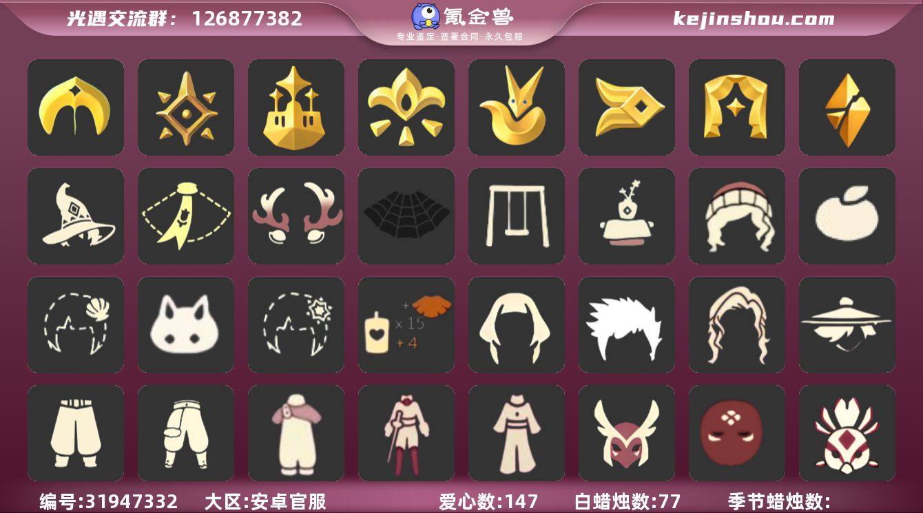 账号类型: 邮箱账号 季节已毕业: 小王子季,风行季,潜海季,表演季,破晓季,欧若拉季,夜行季,追忆季,拾光季,归巢季,九色鹿季,青鸟季 完成地图: 晨岛,云野,雨林,霞谷,暮土,禁阁 珍稀物品: 白枭,透明蝶翼斗,玫瑰花,彩虹围巾 礼包: 围巾,小狐狸,欧若拉之翼,绊爱,鹿角,秋千,茶桌,女巫裙,福娃,雪花球,橘子,贝壳,兔子,南瓜,枯角,雪花,彩虹耳机,四叶草,小提琴,创始人,风之旅人白袍 裤子: 武士裤,背带裤,搓澡巾,王子服,蓝绿裤,飞天裤,青鸟尊贵蓬头裤子 面具: 呼吸面具,夜行毕业面具,黄眉企鹅面具 面饰: 红耳机,黑框眼镜,青鸟毕业面饰 项链: 围巾 发型: 归巢毕业发型,若笠,虚荣,单侧绑发,小王子发型,留辫蘑菇头,飞天盘发 头饰: 羽毛发饰,牛仔帽,蓝色音乐会,平顶帽 斗篷: 海洋斗,绿芽,粉红绒毛斗篷,遥鲲斗篷,燕尾斗篷,冥龙斗篷,玫瑰褶边斗篷,青鸟毕业斗篷 配饰: 雨伞,高音钢琴,相机,玫瑰花,二重奏挂画,鲲灯 亮点: 【优质装备】:表演季,白枭(帝企鹅发),武士裤,小王子季(王子季),风行季,潜海季,破晓季,透明蝶翼斗,欧若拉季(欧若拉),归巢毕业发型(五塑彩羽发),羽毛发饰(多羽发饰),高音钢琴(白色高脚钢琴),玫瑰花,夜行季,追忆季,牛仔帽(西部帽),相机(季卡相机),拾光季,彩虹围巾(五塑彩带斗),归巢季,九色鹿(九色鹿季),王子服(小王子套装),蓝绿裤(高领舞服),飞天裤(柔缎花边连)(九色鹿丝带裤),围巾(肩带),欧若拉之翼,红耳机,围巾(小王子斗篷)(小王子围巾),小狐狸(狐狸背包),晨岛,云野,雨林,霞谷,墓土(暮土),禁阁,若笠(箬笠),青鸟尊贵蓬头裤子(蓝色燕尾服),二重奏挂画(合奏挂画),呼吸面具(潜水面具),夜行毕业面具(棕熊面具),黄眉企鹅面具,黑框眼镜(粗框眼镜),单侧绑发(单边小辫),小王子发型,留辫蘑菇头,粉红绒毛斗篷(绒毛斗篷),遥鲲斗篷(双翼遥鲲斗),燕尾斗篷,冥龙斗篷,鲲灯(追忆之书),飞天盘发(九色鹿丸子头),青鸟季,青鸟毕业面饰(青...