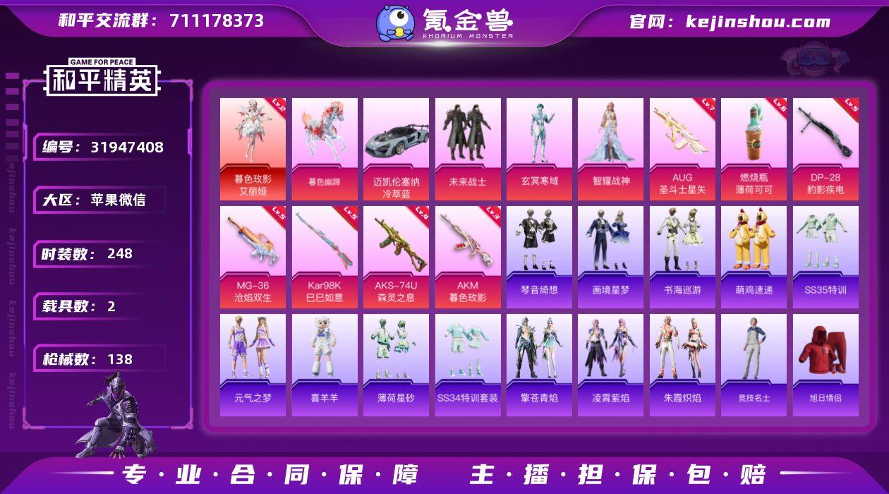 苹果 手Q-12粉装-7特效枪-1载具-3粉色飞行器-98732热力值-20王牌印记-249套装-293枪皮 【热门品类】:粉装-梦幻火箭,粉装-音爆索尼克,粉装-缤纷油彩,套装-浪漫天命,套装-小丑鱼,套装-奇异狩猎者,套装-胖达圆圆,套装-龟仙人,套装-潮萌小黄鸭,套装-粉红小猪,角色-8号机,角色-Mark.06 【粉色套装】:粉装-数码大师,粉装-宝贝奶油派,粉装-天使彩虹糖,粉装-梦幻火箭,粉装-缤纷油彩,粉装-王牌四分卫,粉装-音爆索尼克,粉装-飒粉甜心,角色-猩猩队长,角色-圣堂之誓,角色-荧海星豚,角色-羊梦糖心 【粉色枪皮等级】:SCAR-L-纯梦嫁纱(七级),M416-风花雪月(四级),M416-电玩时刻(五级),AUG-星之彼岸(七级),蜜獾-荧海星豚(四级),Kar98K-巳巳如意(五级),DP-28-豹影疾电(四级) 【粉色载具】:特斯拉Roadster(沁心粉) 【粉色枪皮】:SCAR-L-纯梦嫁纱,M416-风花雪月,M416-电玩时刻,AUG-星之彼岸,蜜獾-荧海星豚,Kar98K-巳巳如意,DP-28-豹影疾电 【粉色飞行器】:绮梦青鸾飞行器,梦之光华飞行器,巴啦啦小魔仙飞行器 【粉色降落伞】:甜心宝贝降落伞,梦幻火箭降落伞,锦绣火鲤降落伞,阿狸红降落伞,银刃赛罗降落伞,王牌四分卫降落伞,绮梦青鸾降落伞,星之彼岸降落伞,怪笑疯兔降落伞,暗夜玫瑰降落伞,暖熊萌萌降落伞,垂柳戏鸭降落伞,第五大道降落伞,仲夏莫吉托降落伞,飒粉甜心降落伞,未来歌姬降落伞,炫光之旅降落伞,樱桃泡泡降落伞 【稀有套装】:套装-龟仙人,玩偶服-憨乐熊二,角色-米开朗基罗,套装-燕燕于飞,套装-鱼渊荷华,角色-糖霜甜心 【稀有枪皮】:AKM-四圣焕新,AKM-彩虹符号,AKM-星之彼岸,AKM-春暖花开,AKM-灼热熔岩,AKM-筑梦精灵,AKM-萌趣颜团子,AKM-虎虎生威,AKM-霓虹街区,AKM-龙的传人,M16A4-幻世战舞者,M16A4-机械英豪,M16A4-甜心亚梦,M16A4-蓝色火焰...