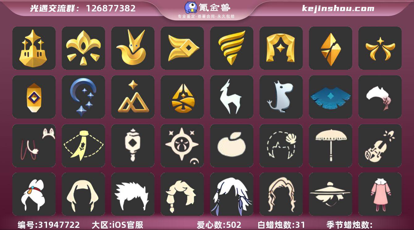 账号类型: 邮箱账号 季节已毕业: 潜海季,表演季,破晓季,欧若拉季,夜行季,追忆季,拾光季,归巢季,九色鹿季,筑巢季,二重奏季,姆明季,彩染季,青鸟季 完成地图: 晨岛,云野,雨林,霞谷,暮土,禁阁 珍稀物品: 白枭,透明蝶翼斗,彩虹围巾 礼包: 蝙蝠套,巫师,欧若拉之翼,九色鹿角,莲花斗,绊爱,鹿角,蜘蛛斗,茶桌,瑞雪,福娃,吉他,灯笼,橘子,贝壳,红伞,兔子,南瓜,枯角,雪花,水母,猫背饰,星月头饰,彩虹耳钉,彩虹耳机,蝴蝶结,奥利奥,四叶草,向日葵套,新年耳钉,创始人,海蓝波浪发型,姆明饰品套装,衔福献瑞礼包,献瑞折扇礼包,青衫落拓礼包 裤子: 武士裤,背带裤,搓澡巾,击剑裤,妮妮裙子,蓝绿裤,飞天裤,筑巢季·裤子,青鸟尊贵蓬头裤子 面具: 呼吸面具,夜行毕业面具,黄眉企鹅面具,辉光羚羊面具 面饰: 红耳机,黑框眼镜,青鸟毕业面饰 项链: 围巾 发型: 归巢毕业发型,若笠,虚荣,单侧绑发,留辫蘑菇头,飞天盘发,海蓝波浪发型 头饰: 牛仔帽,蓝色音乐会,平顶帽 斗篷: 海洋斗,绿芽,粉红绒毛斗篷,遥鲲斗篷,燕尾斗篷,冥龙斗篷,彩染围巾斗篷,青鸟毕业斗篷 配饰: 雨伞,筑巢季·小手办,高音钢琴,姆明抱枕,小红伞,相机,二重奏挂画,鲲灯 亮点: 【优质装备】:表演季,白枭(帝企鹅发),武士裤,潜海季,破晓季,透明蝶翼斗,欧若拉季(欧若拉),归巢毕业发型(五塑彩羽发),筑巢季·小手办(光之子试衣),高音钢琴(白色高脚钢琴),夜行季,追忆季,妮妮裙子(妮妮长裙),牛仔帽(西部帽),姆明抱枕,小红伞(姆明红伞)(姆明大伞),相机(季卡相机),拾光季,彩虹围巾(五塑彩带斗),归巢季,九色鹿(九色鹿季),蓝绿裤(高领舞服),飞天裤(柔缎花边连)(九色鹿丝带裤),围巾(肩带),筑巢季,蝙蝠套(蝙蝠斗篷)(南瓜头),欧若拉之翼,福娃(福娃礼包)(春之日礼包)(铜钱斗),莲花斗(异彩莲花斗篷),绊爱(绊爱斗篷)(绊爱礼包),茶桌(花憩茶桌),红耳机,九色鹿角(神鹿祝福头饰)(神鹿祝福礼包),鹿角(圣诞鹿角),...