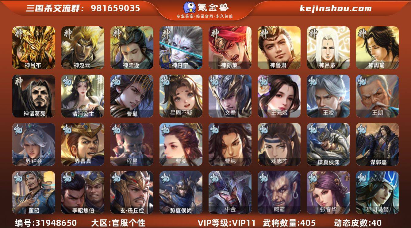 官阶:大将军;VIP等级:VIP11;史诗武将数量:52;动态皮肤数量:40;武将总数:405;史诗宝珠数量:0;将魂数量:758;神将:7;魏国史诗武将:28;蜀国史诗武将:9;吴国史诗武将:10;群史诗武将:17