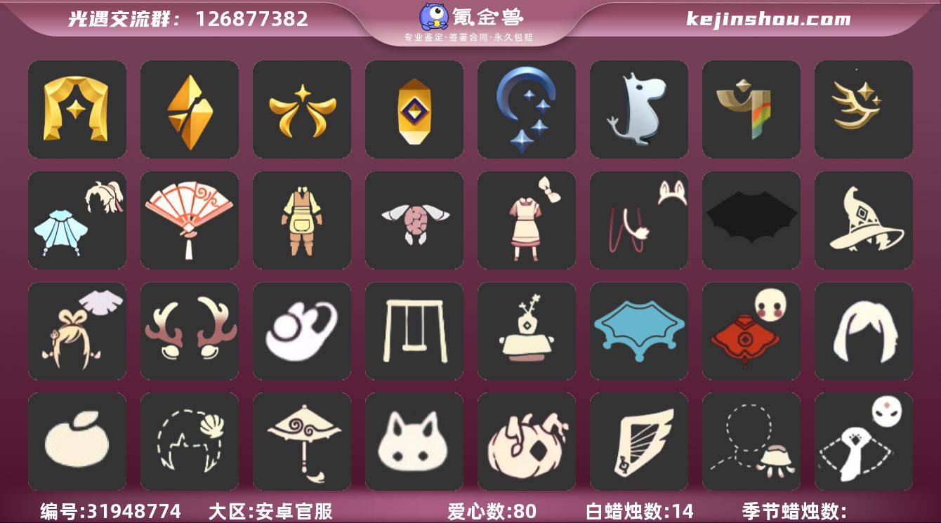 账号类型: 手机账号 季节已毕业: 表演季,破晓季,欧若拉季,夜行季,追忆季,姆明季,彩染季,迁徙季 完成地图: 晨岛,云野,雨林,霞谷,暮土,禁阁 珍稀物品: 白枭,透明蝶翼斗 礼包: 蝙蝠套,巫师,绊爱,鹿角,兔子鞋,秋千,茶桌,瑞雪,福娃,奔跑发型,橘子,贝壳,红伞,兔子,南瓜,竖琴,水母,猫套,星月头饰,新年裤,蝴蝶结,四叶草,透明蛛丝,新年耳钉,创始人,姆明饰品套装,爱丽丝围裙套装礼包,海龟斗篷,园丁装扮,献瑞折扇礼包,青衫落拓礼包 裤子: 武士裤,背带裤,搓澡巾,妮妮裙子,蓝绿裤,飞天裤 面具: 夜行毕业面具,黄眉企鹅面具,辉光羚羊面具 面饰: 红耳机,青鸟毕业面饰 项链: 围巾 发型: 若笠,虚荣,留辫蘑菇头,飞天盘发 头饰: 蓝色音乐会,平顶帽 斗篷: 海洋斗,绿芽,粉红绒毛斗篷,遥鲲斗篷,燕尾斗篷,冥龙斗篷,彩染围巾斗篷 配饰: 雨伞,高音钢琴,姆明抱枕,小红伞,鲲灯 亮点: 【优质装备】:表演季,白枭(帝企鹅发),武士裤,破晓季,透明蝶翼斗,欧若拉季(欧若拉),高音钢琴(白色高脚钢琴),夜行季,追忆季,妮妮裙子(妮妮长裙),姆明抱枕,小红伞(姆明红伞)(姆明大伞),蓝绿裤(高领舞服),飞天裤(柔缎花边连)(九色鹿丝带裤),围巾(肩带),姆明季,夜行毕业面具(棕熊面具),黄眉企鹅面具,留辫蘑菇头,粉红绒毛斗篷(绒毛斗篷),遥鲲斗篷(双翼遥鲲斗),燕尾斗篷,冥龙斗篷,鲲灯(追忆之书),辉光羚羊面具,彩染季,飞天盘发(九色鹿丸子头),青鸟毕业面饰(青鸟面饰),蝙蝠套(蝙蝠斗篷)(南瓜头),福娃(福娃礼包)(春之日礼包)(铜钱斗),绊爱(绊爱斗篷)(绊爱礼包),秋千(情人秋千),茶桌(花憩茶桌),猫套(皮皮猫斗)(皮皮猫礼包),红耳机,鹿角(圣诞鹿角),瑞雪(瑞雪斗篷)(暖冬瑞雪),红伞(瑞气纸伞),透明蛛丝(透明蜘蛛斗),海龟斗篷,姆明饰品套装(姆明尾巴),爱丽丝围裙套装礼包,巫师(巫师帽),新年裤(瑞气服饰),园丁装扮,晨岛,云野,雨林,霞谷,墓土(暮土),禁阁,若笠(箬笠),兔子鞋(兔子...