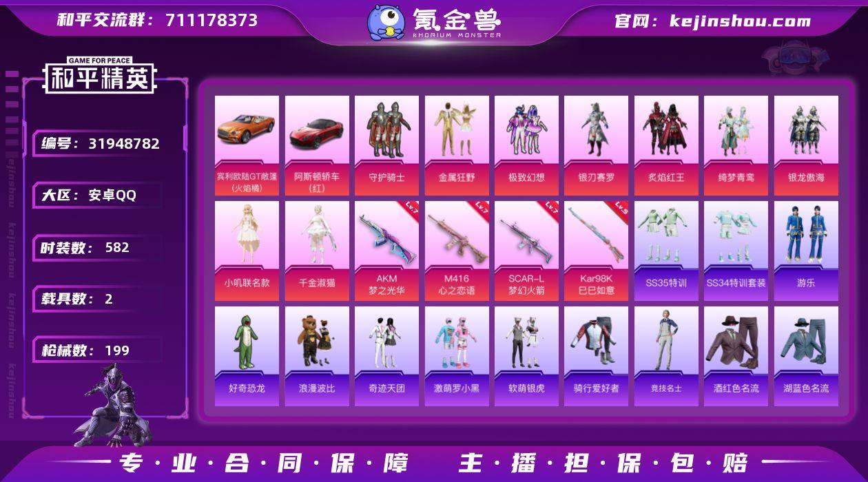 实名: 可修改 时装数: 582 载具数: 2 枪械数: 199 战备数: 2 热门装扮: 守护骑士,浪漫波比,金属狂野,好奇恐龙,极致幻想,炙焰红王,银刃赛罗,绮梦青鸾,银龙傲海,激萌罗小黑,奇迹天团,软萌银虎,小叽联名款,千金淑猫 载具: 阿斯顿·马丁DBS(红),宾利欧陆GT敞篷(火焰橘) 稀有枪皮: SCAR-L梦幻火箭,M416心之恋语,AKM梦之光华,Kar98K-巳巳如意 亮点: 【优质装备】:阿斯顿·马丁DBS(红),宾利欧陆GT敞篷(火焰橘),SCAR-L梦幻火箭,M416心之恋语,守护骑士,金属狂野,极致幻想,炙焰红王,银刃赛罗,绮梦青鸾,AKM梦之光华,七级AKM-梦之光华,七级M416-心之恋语,七级SCAR-L-梦幻火箭,千金淑猫,Kar98K-巳巳如意