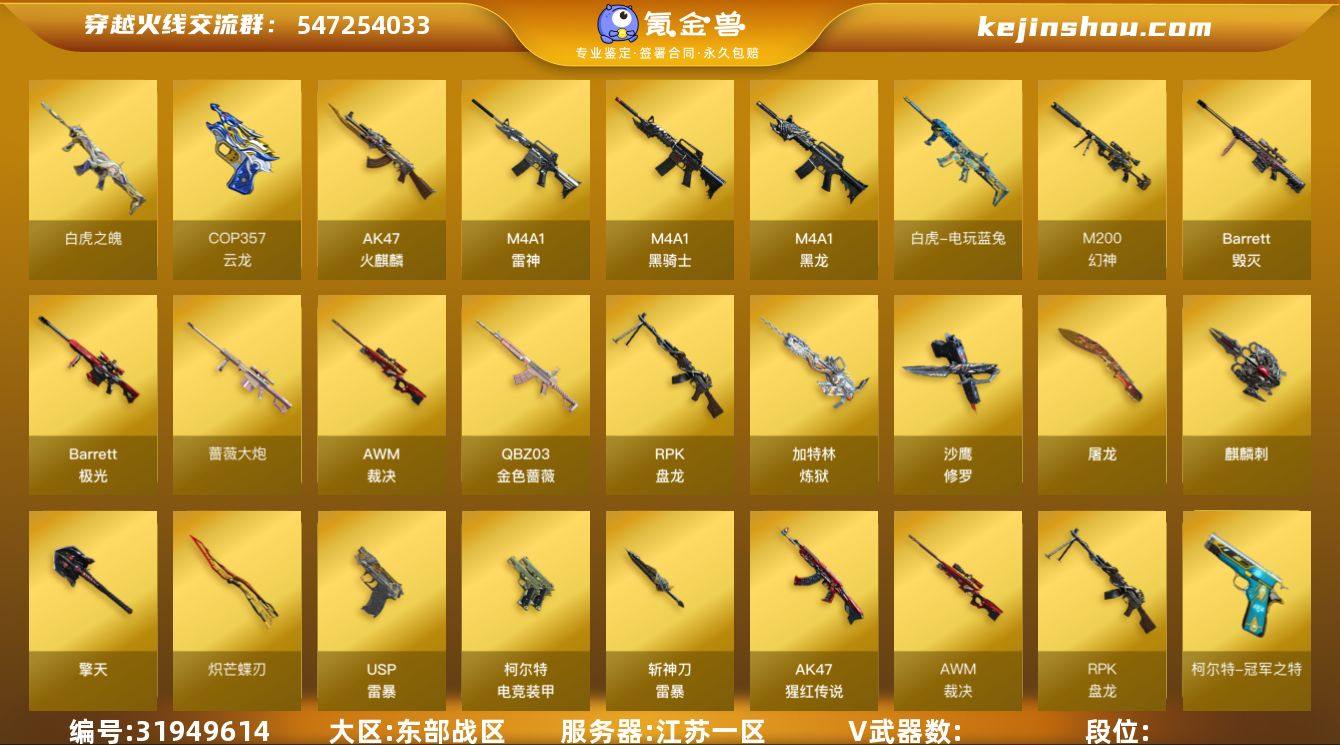 L629435 【四防传说艾莉莎/幻神三件套(音效卡+荣耀世冠白鲨+宠儿)/裁决/天戎/玄豹/白虎之魄/金色蔷薇/天罚(音效卡)/白虎蓝兔/盘龙*6+炼狱*2/USP雷暴/柯尔特-冠军之特/COP云龙/炽芒蝶刃/冠军之刃/皮肤:毁灭-魔灵+冠军之怒/火麒麟-巅峰荣耀/雷神-荣耀之魄+冠军之魄/】 会员等级6 英雄级武器数量85 【可二次实名】 【永久包赔】 【能人脸包赔】 【VIP 6】 【能排位】 【枪王】 王者炫金武器1 热门武器8 英雄级武器30 稀有武器6 暴走生化5 挑战大师1 角色7 稀有皮肤25 音效卡6 投掷武器15 王者炫金武器:白虎之魄; 热门武器:COP 357-云龙,炽芒蝶刃,USP-雷暴,M200-幻神,柯尔特-冠军之特,斯泰尔-蝴蝶,炼狱-迷你小钢,Knife-冠军之刃; 英雄级武器:AWM-裁决,Scar Light-玄豹,Anaconda-玄豹,丛林匕首-玄豹,麒麟刺-百战金芒,炼狱-百战金芒,QBZ03-天罚,FAMAS G2-天戎,擎天,机械迷城-穹宇,AK-47-猩红传说,M4A1-黑龙,斩神刀-雷暴,龙啸-烈火龙威,麒麟刺,唐刀-神工天巧,M4A1-黑骑士,无影-神兵利器,AK47-火麒麟,QBZ03-金色蔷薇,柯尔特-电竞装甲,白虎-电玩蓝兔,RPK-盘龙,沙鹰-修罗,屠龙,barrett-金色蔷薇,Barrett-毁灭,M4A1-雷神,加特林-炼狱,Barrett-极光; 稀有武器:夺魂,加利尔ACE-零号,迷你钢铁终结者,COP-白鲨,迷你波特博士,AWM-灵狐-15周年嘉年华; 暴走生化:轻型军用手斧-镜,轻型军用手斧-镜,恶魔终结者-湮灭之柱,女皇终结者-魔龙之吻,6盘龙; 挑战大师:冰龙粉碎者-白马银枪; 角色:传说艾莉莎,兰巾帼英雄,战地猎狐,灵狐者黄金海岸,兰-海滩派对,灵动武士,超能女侍·觉; 稀有皮肤:火麒麟-CFSTAR,天龙-CFSTAR,修罗-CFSTAR,火麒麟-雷神,毁灭-SV-CFPLS16冠军,AK47-B-常胜将军-刘备,幻神-宠儿-2021MVP,雷神-宠儿-2019MVP,雷神-传奇N9,擎天-冠军之击,火麒...